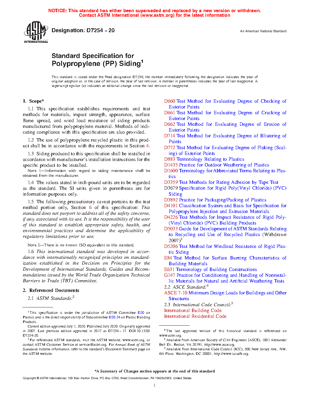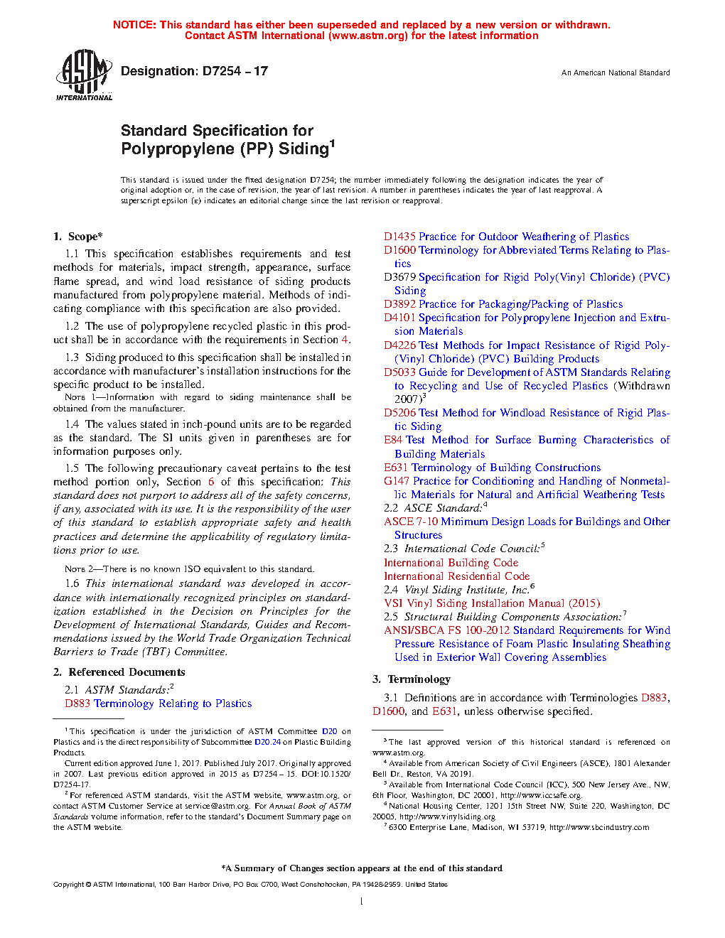 1.1 This specification establishes requirements and test methods for materials, impact strength, appearance, surface flame spread, and wind load resistance of siding products manufactured from polypropylene material. Methods of indicating compliance with this specification are also provided.
