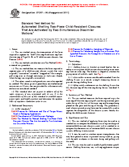 1.3 This test method does not measure the force required to separate parts of a child-resistant closure system that were originally “screwed-on” instead of “snapped-on” (for example, pull a cap over or through continuous or multi-start threads when the cap was originally screwed on).