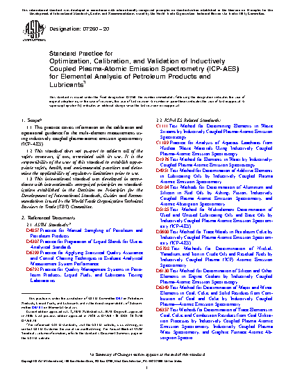 5.2 Inductively coupled plasma-atomic emission spectrometry is one of the more widely used analytical techniques in the oil industry for multi-element analysis as evident from at least twelve standard test methods (for example, Test Methods C1111, D1976, D4951, D5184, D5185, D5600, D5708, D6130, D6349, D6357, D7040, D7111, D7303, and D7691) published for the analysis of fossil fuels and related materials. These have been briefly summarized by Nadkarni (1).5