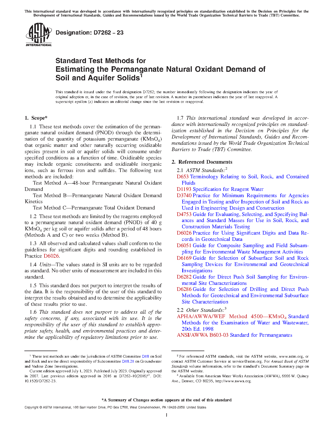 1.1 This test method covers the estimation of the permanganate natural oxidant demand (PNOD) through the determination of the quantity of potassium permanganate (KMnO4) that organic matter and other naturally occurring oxidizable species present in soil or aquifer solids will consume under specified conditions as a function of time. Oxidizable species may include organic constituents and oxidizable inorganic ions, such as ferrous iron and sulfides. The following test methods are included: