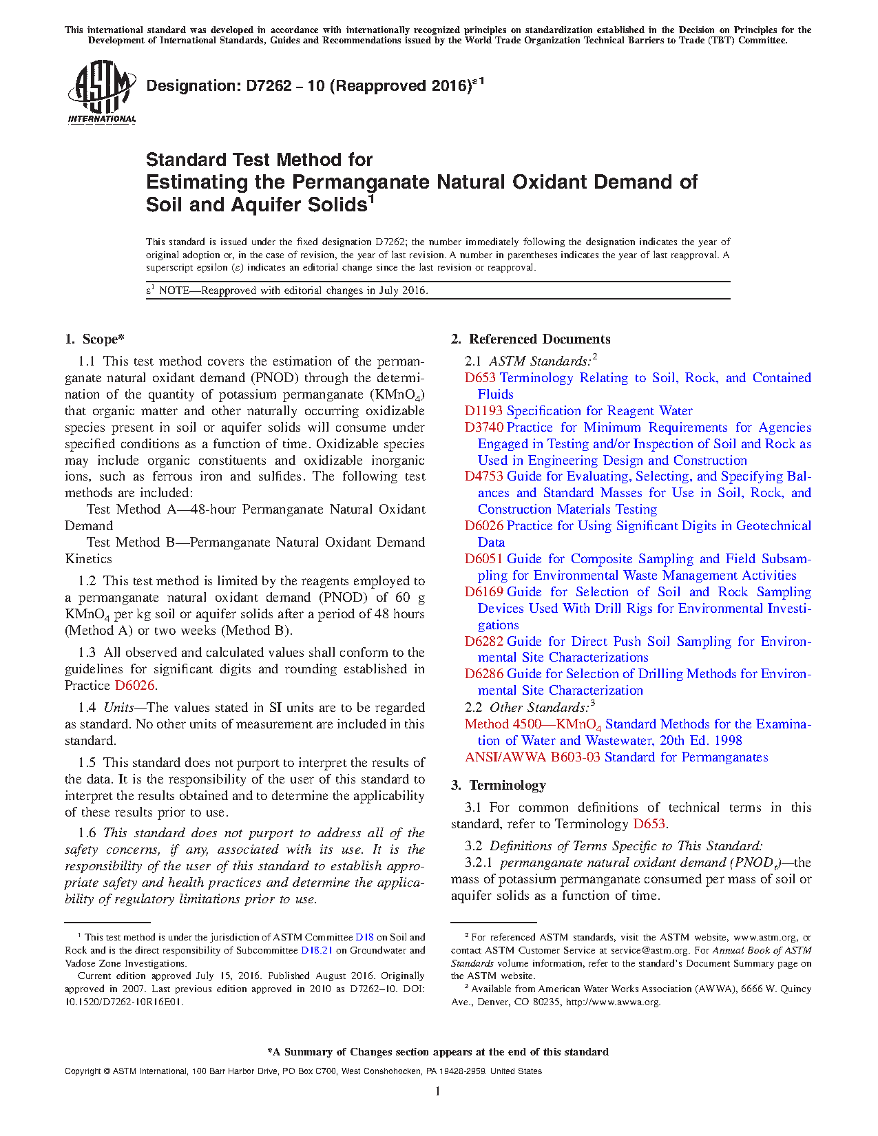Test Method A Test Method B 1.2 This test method is limited by the reagents employed to a permanganate natural oxidant demand (PNOD) of 60 g KMnO4 per kg soil or aquifer solids after a period of 48 hours (Method A) or two weeks (Method B). 1.3 All observed and calculated values shall conform to the guidelines for significant digits and rounding established in Practice D6026. 1.4 Units—The values stated in SI units are to be regarded as standard. No other units of measurement are included in this standard. 1.5 This standard does not purport to interpret the results of the data. It is the responsibility of the user of this standard to interpret the results obtained and to determine the applicability of these results prior to use. 1.6 This standard does not purport to address all of the safety concerns, if any, associated with its use. It is the responsibility of the user of this standard to establish appropriate safety and health practices and determine the applicability of regulatory limitations prior to use. The test method is used to estimate the permanganate natural oxidant demand exerted by the soil or aquifer solids by determining the quantity of potassium permanganate that is consumed by naturally occurring species as a function of time. Typically the measurement of PNOD is used to screen potential sites for in situ chemical oxidation (ISCO) with permanganate (Test Method A) and provide information to aid in the design of remediation systems (Test Method B). While some oxidizable species react relatively quickly (that is, days to weeks), others react more slower (weeks to months). Consequently, the PNODt is expected to be some fraction of the PNODmax. Due to mass transport related issues at the field-scale it is reasonable to assume that the PNODt measured using the test method may overestimate the demand exerted during ISCO applications. Note 1—The quality of the result produced by this standard is dependent on the competence of the personnel performing it, and the suitability of the equipment and facilities used. Agencies that meet the criteria of Practice D3740 are generally considered capable of competent and objective testing/sampling/inspection/and so forth.