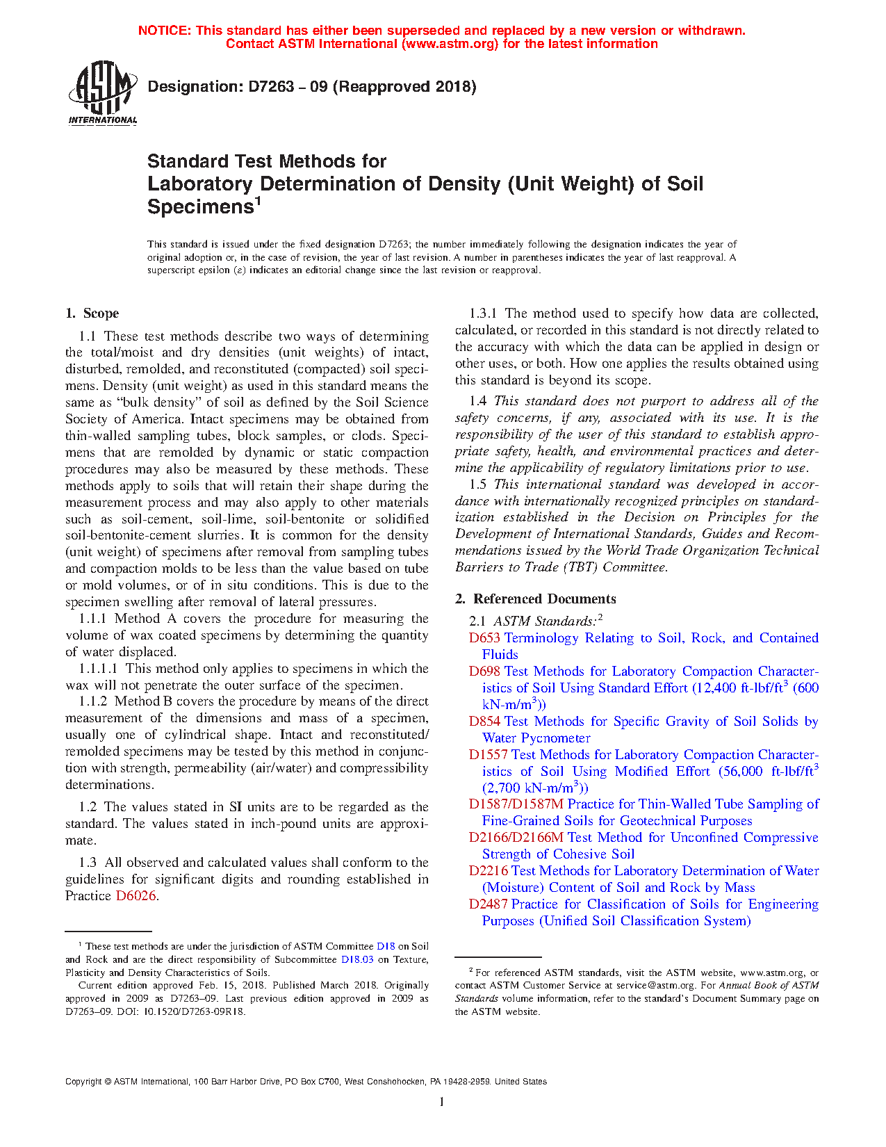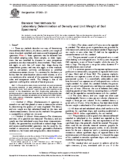 1.1 These test methods describe two ways of determining the total/moist and dry densities (unit weights) of intact, disturbed, remolded, and reconstituted (compacted) soil specimens. Density (unit weight) as used in this standard means the same as “bulk density” of soil as defined by the Soil Science Society of America. Intact specimens may be obtained from thin-walled sampling tubes, block samples, or clods. Specimens that are remolded by dynamic or static compaction procedures may also be measured by these methods. These methods apply to soils that will retain their shape during the measurement process and may also apply to other materials such as soil-cement, soil-lime, soil-bentonite or solidified soil-bentonite-cement slurries. It is common for the density (unit weight) of specimens after removal from sampling tubes and compaction molds to be less than the value based on tube or mold volumes, or of in-situ conditions. This is due to the specimen swelling after removal of lateral pressures.