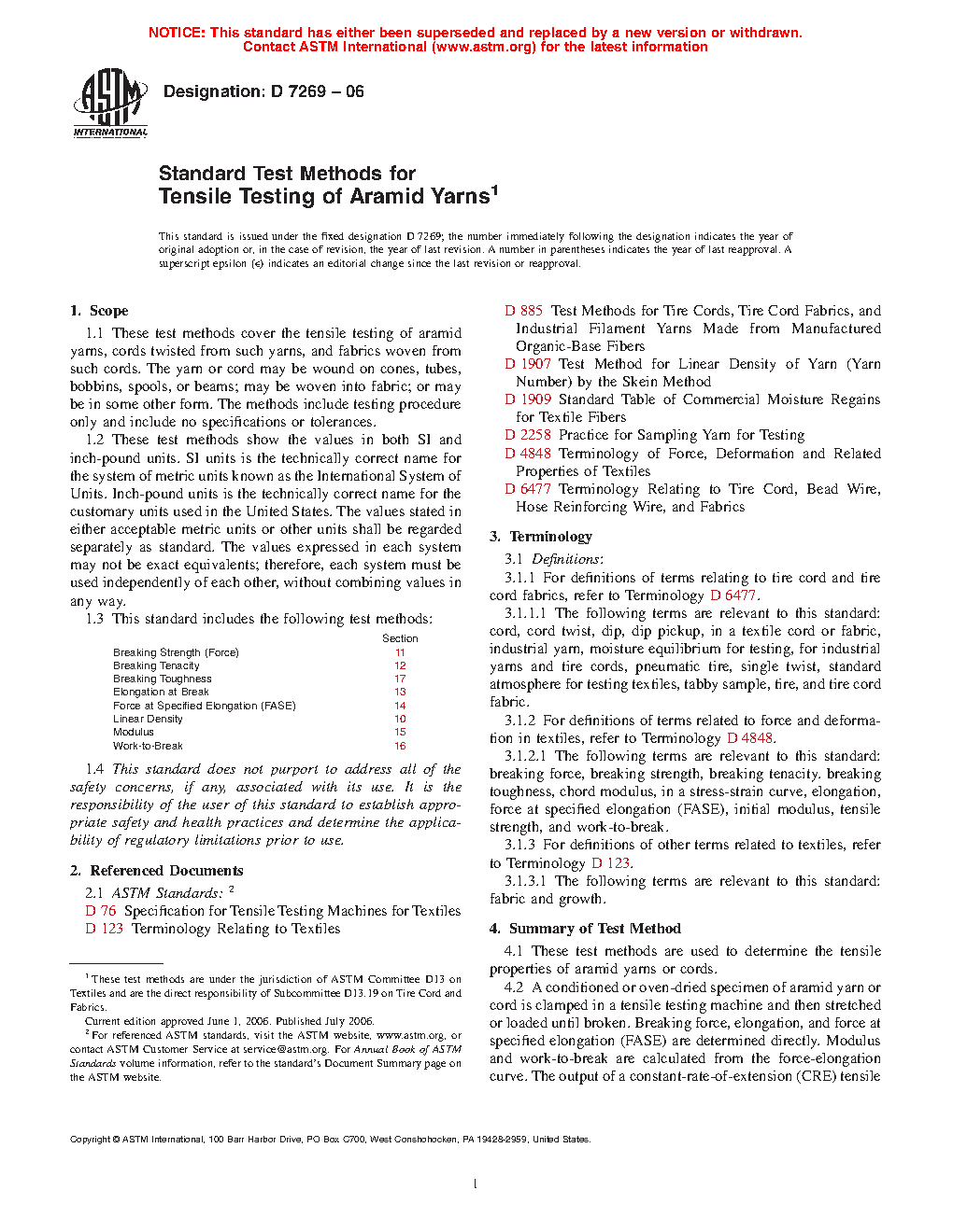 1.1 These test methods cover the tensile testing of aramid yarns, cords twisted from such yarns, and fabrics woven from such cords. The yarn or cord may be wound on cones, tubes, bobbins, spools, or beams; may be woven into fabric; or may be in some other form. The methods include testing procedure only and include no specifications or tolerances.