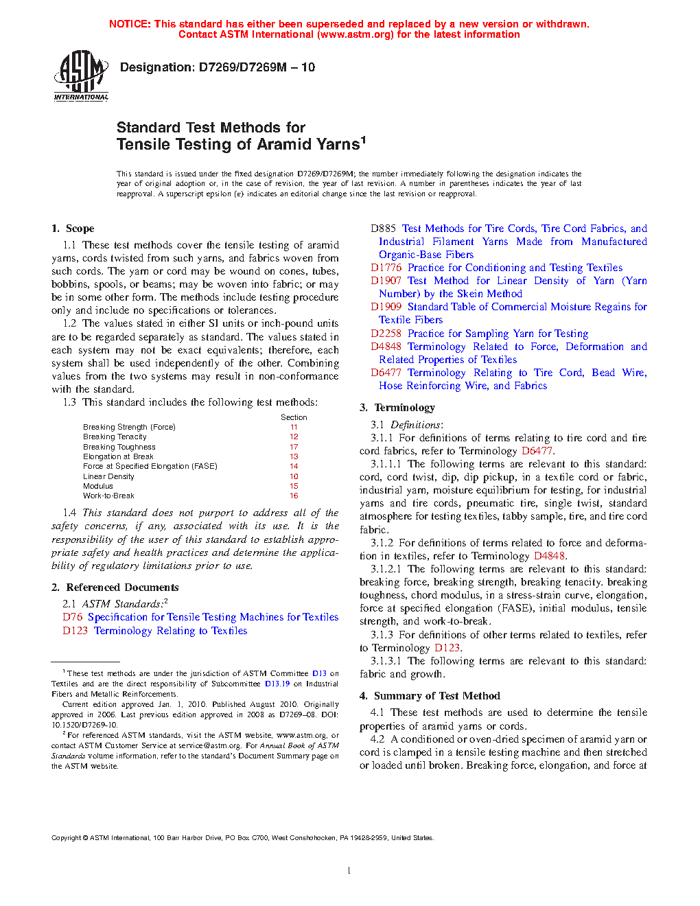 1.1 These test methods cover the tensile testing of aramid yarns, cords twisted from such yarns, and fabrics woven from such cords. The yarn or cord may be wound on cones, tubes, bobbins, spools, or beams; may be woven into fabric; or may be in some other form. The methods include testing procedure only and include no specifications or tolerances.