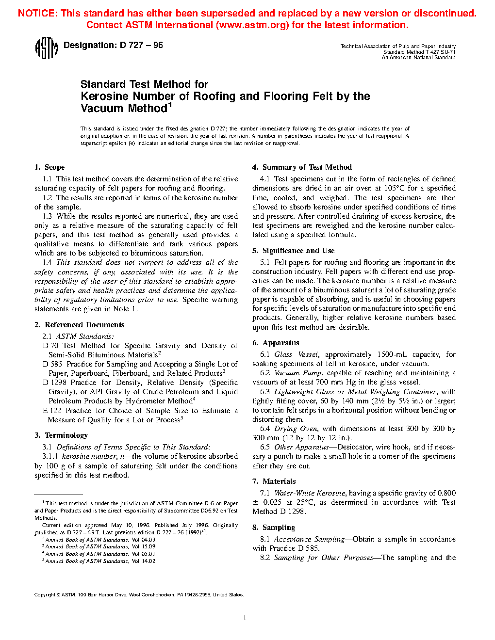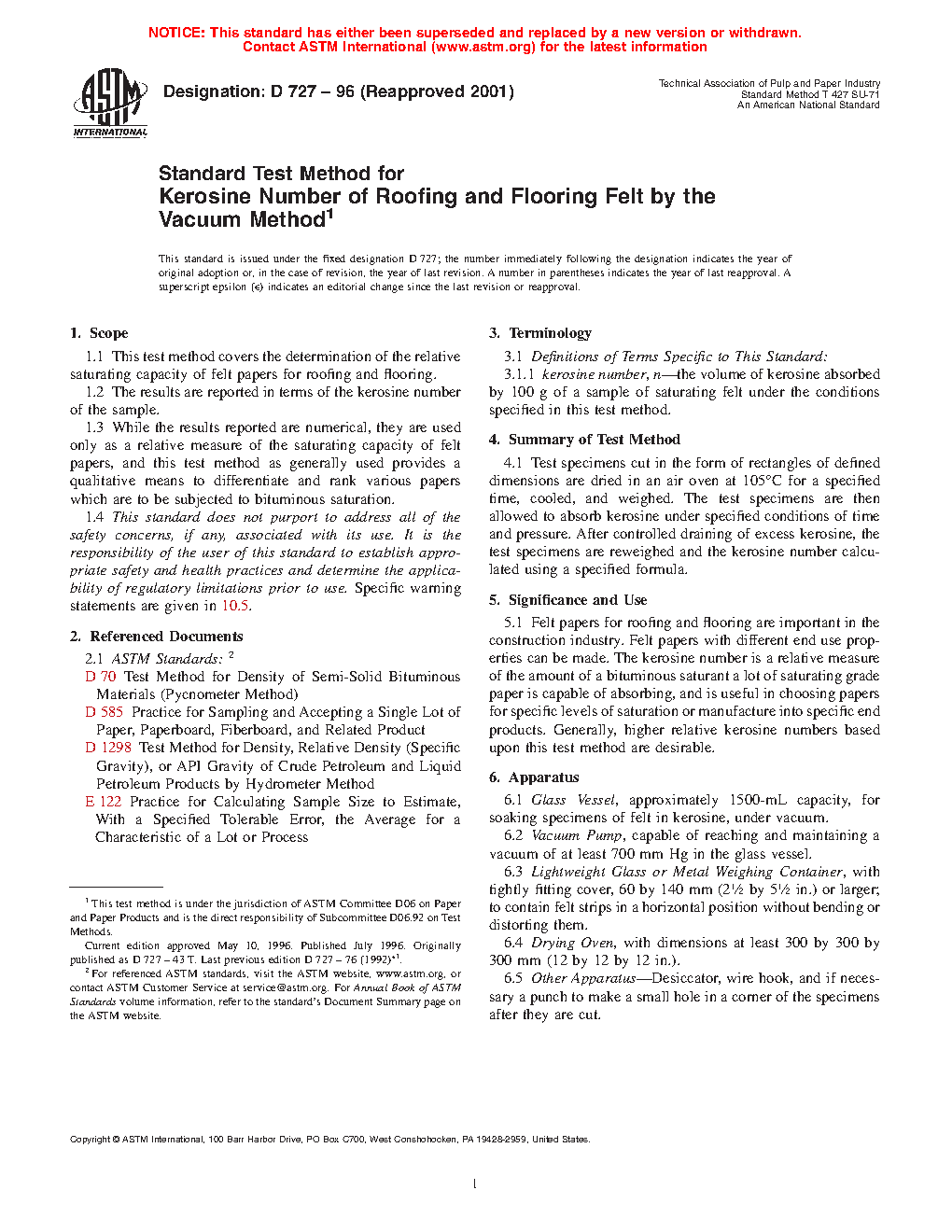 1.1 This test method covers the determination of the relative saturating capacity of felt papers for roofing and flooring.