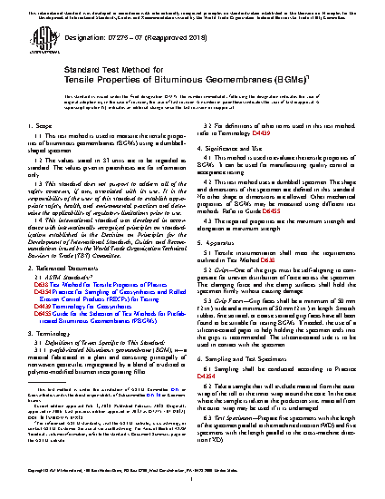 1.1 This test method is used to measure the tensile properties of bituminous geomembranes (BGMs) using a dumbbell-shaped specimen.