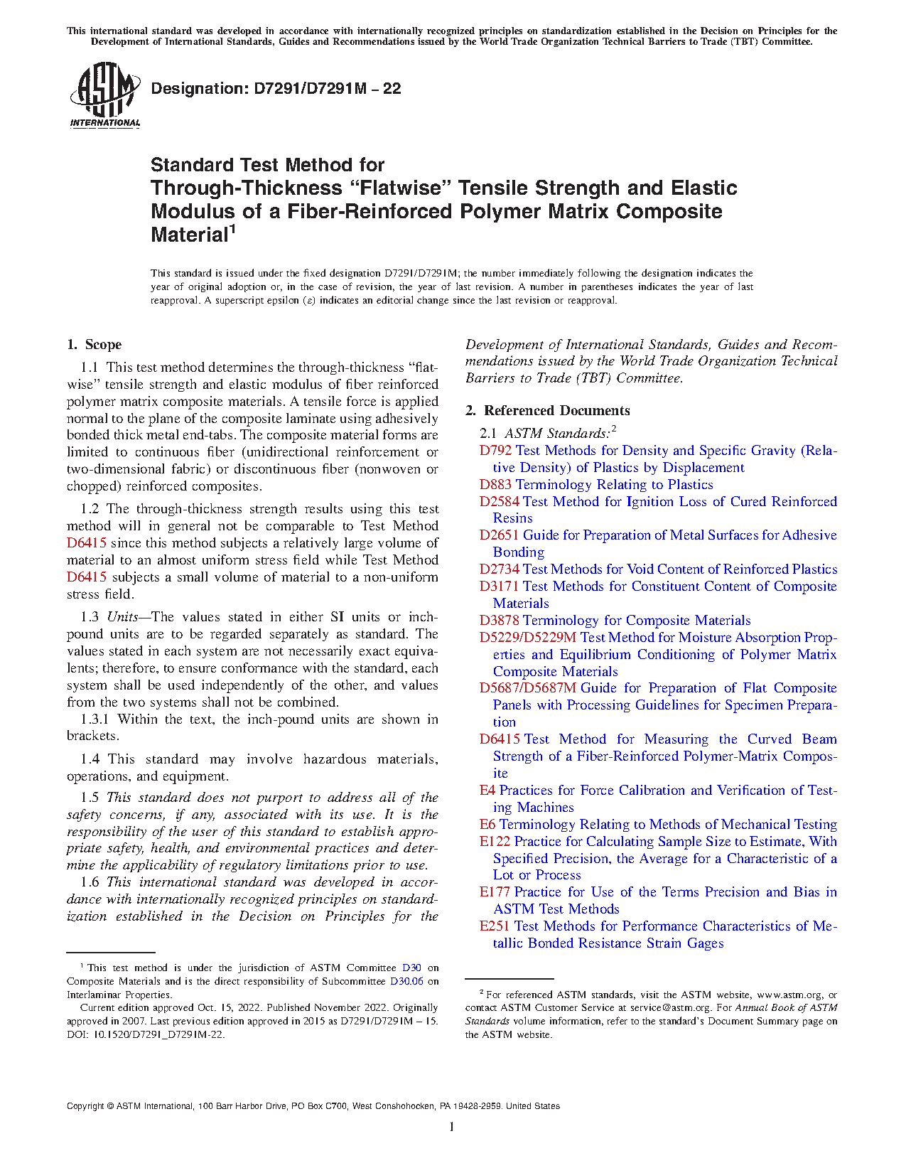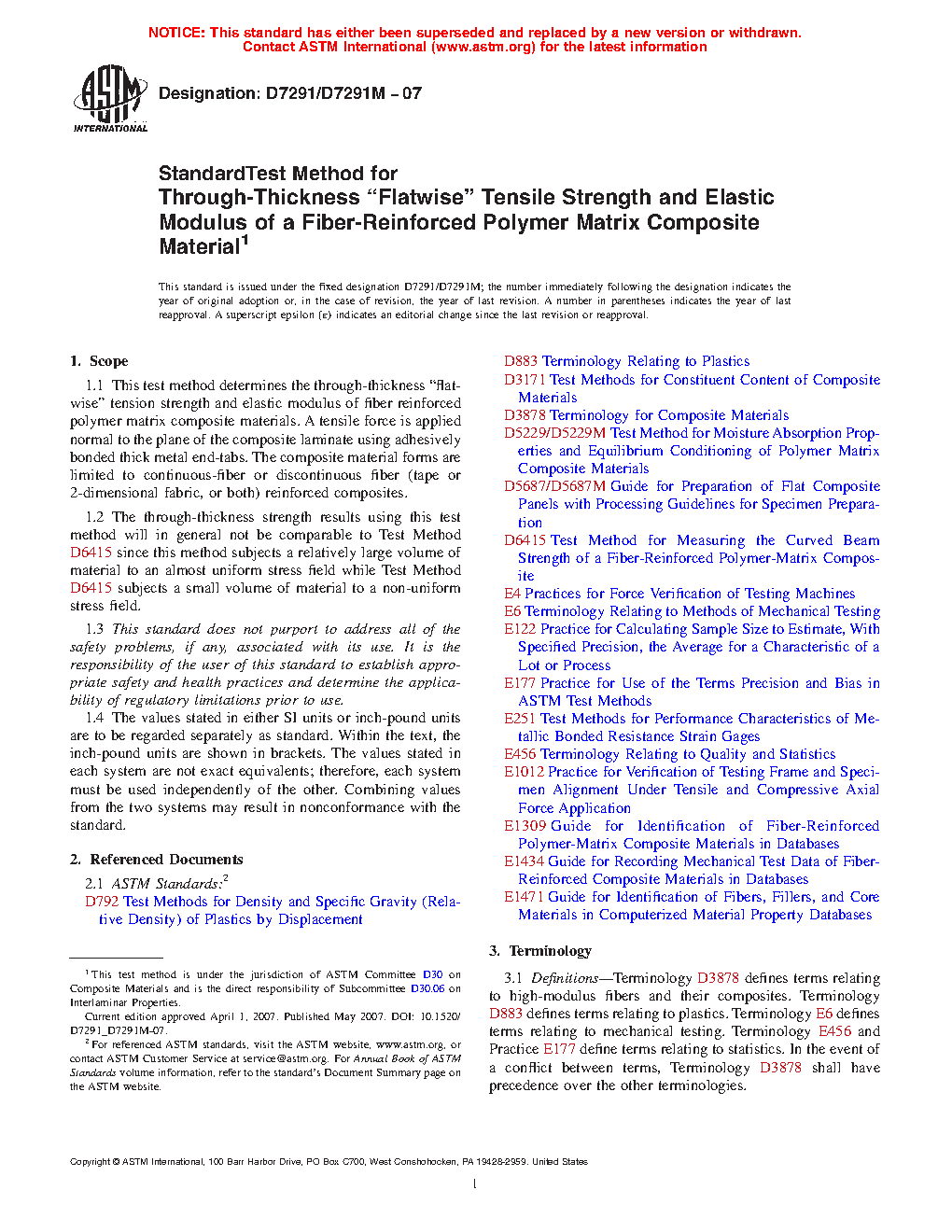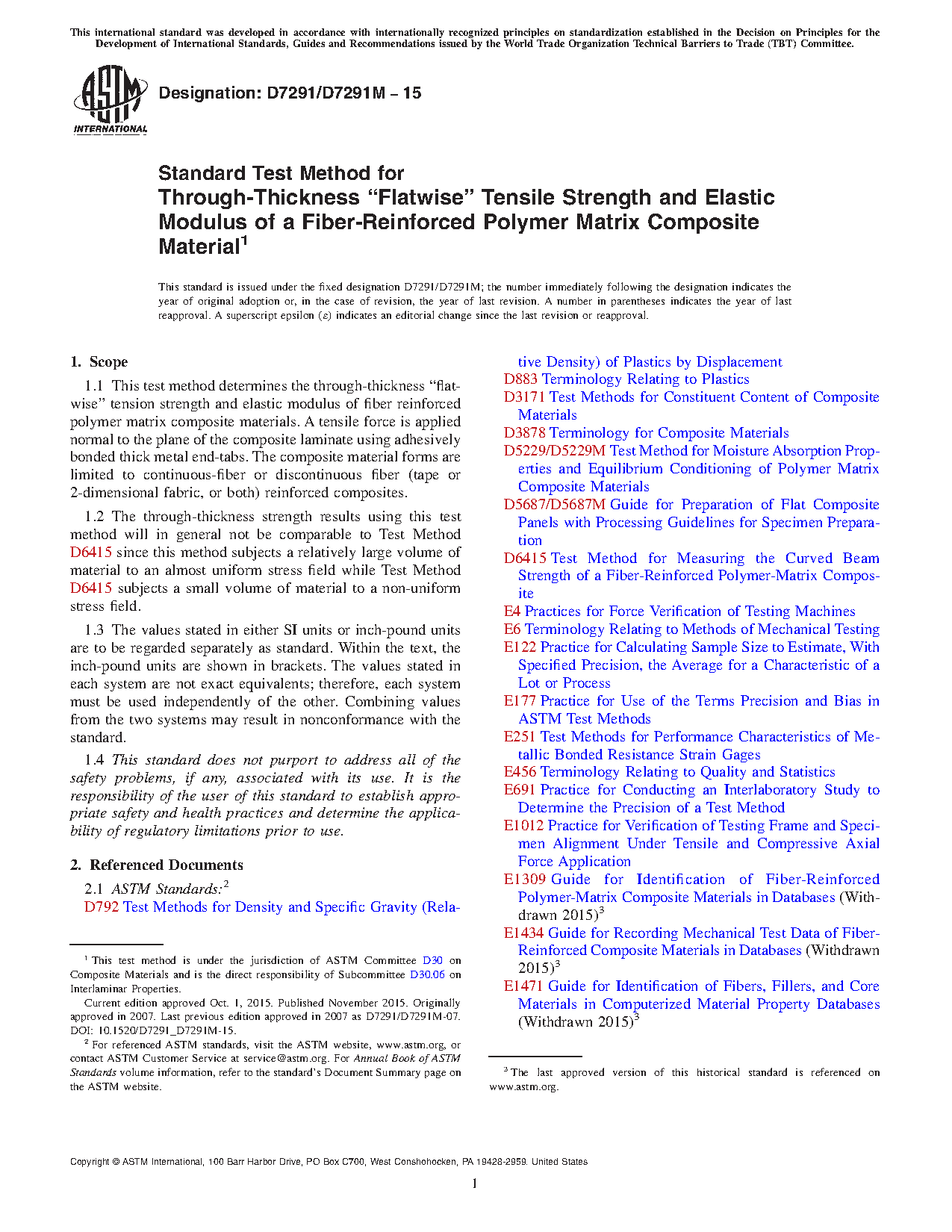 1.1 This test method determines the through-thickness “flatwise” tensile strength and elastic modulus of fiber reinforced polymer matrix composite materials. A tensile force is applied normal to the plane of the composite laminate using adhesively bonded thick metal end-tabs. The composite material forms are limited to continuous fiber (unidirectional reinforcement or two-dimensional fabric) or discontinuous fiber (nonwoven or chopped) reinforced composites.
