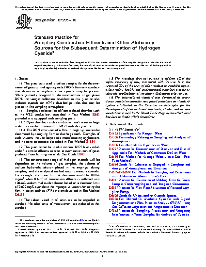 1.1 This practice is used to collect samples for the determination of gaseous hydrogen cyanide (HCN) from any combustion device or atmosphere where cyanide may be present. While primarily designed for the measurement of gas phase HCN, the sample collection described in this practice also includes cyanide ion (CN-) absorbed particles that may be present in the sampling atmosphere.