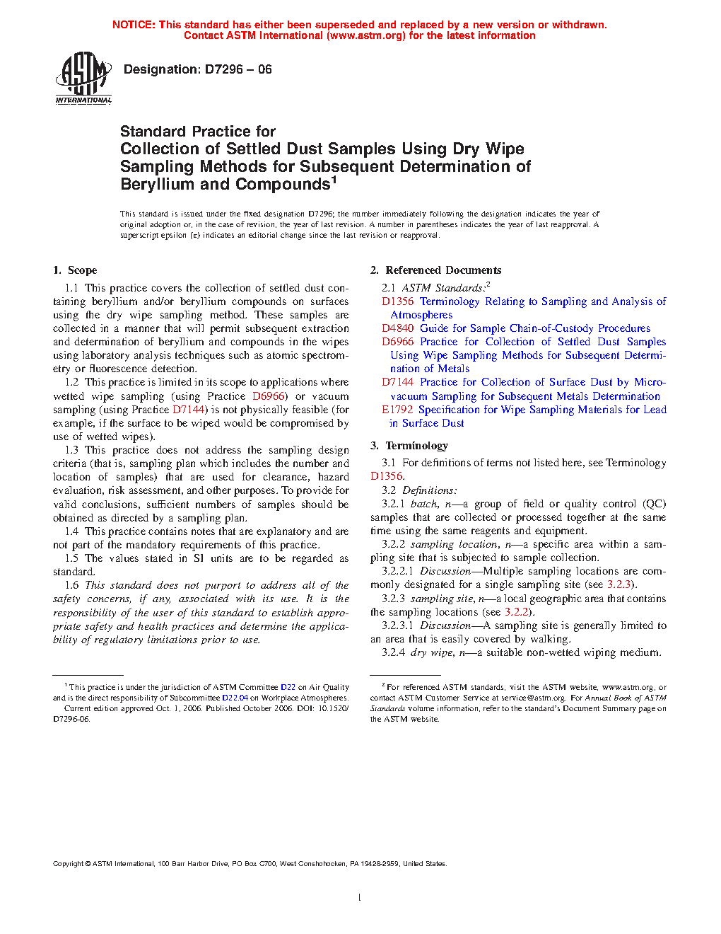 This practice is intended for the collection of settled dust samples for the subsequent measurement of beryllium and compounds. The practice is meant for use in the collection of settled dust samples that are of interest in clearance, hazard evaluation, risk assessment, and other purposes.