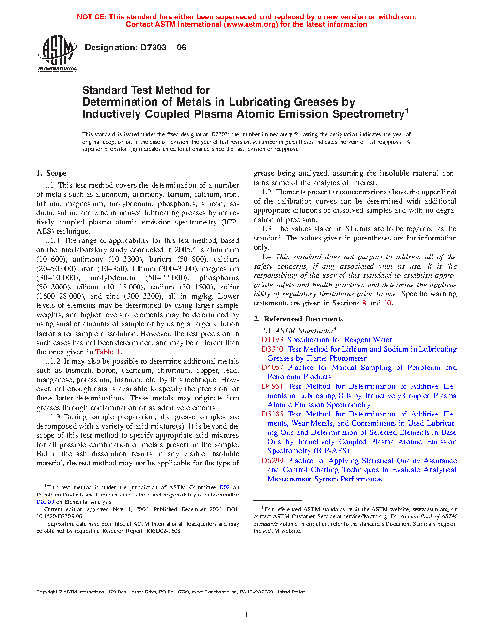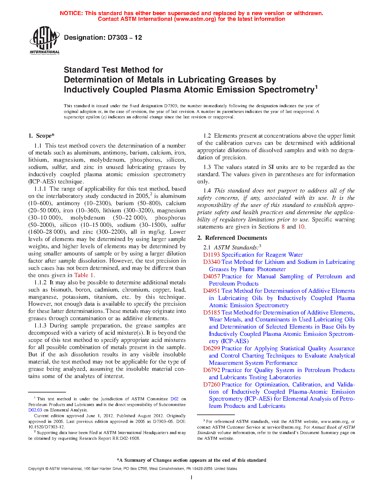1.1 This test method covers the determination of a number of metals such as aluminum, antimony, barium, calcium, iron, lithium, magnesium, molybdenum, phosphorus, silicon, sodium, sulfur, and zinc in unused lubricating greases by inductively coupled plasma atomic emission spectrometry (ICP-AES) technique.