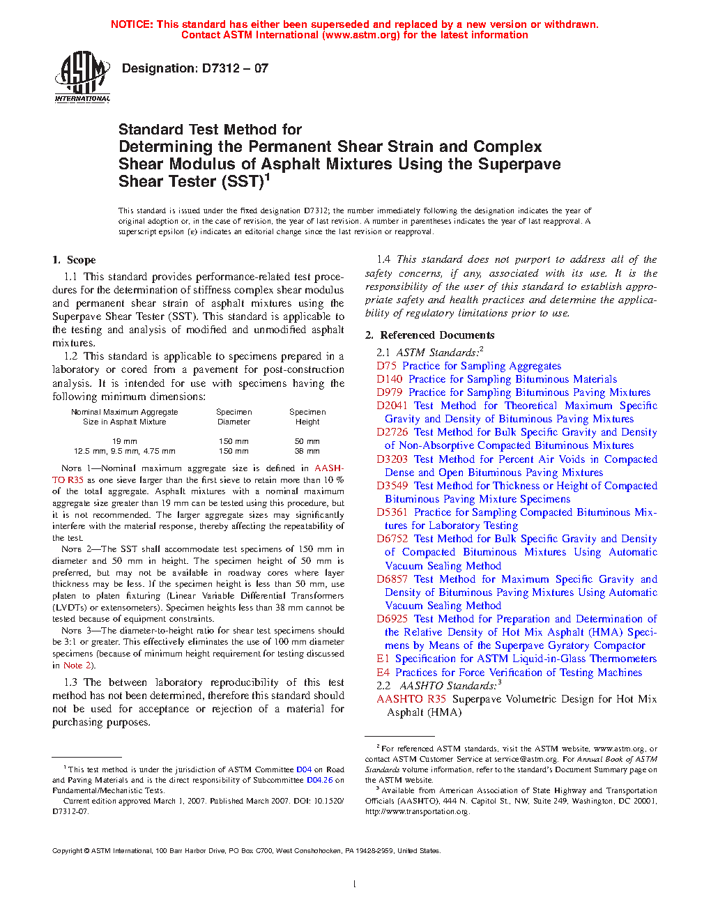 1.1 This standard provides performance-related test procedures for the determination of stiffness complex shear modulus and permanent shear strain of asphalt mixtures using the Superpave Shear Tester (SST). This standard is applicable to the testing and analysis of modified and unmodified asphalt mixtures.