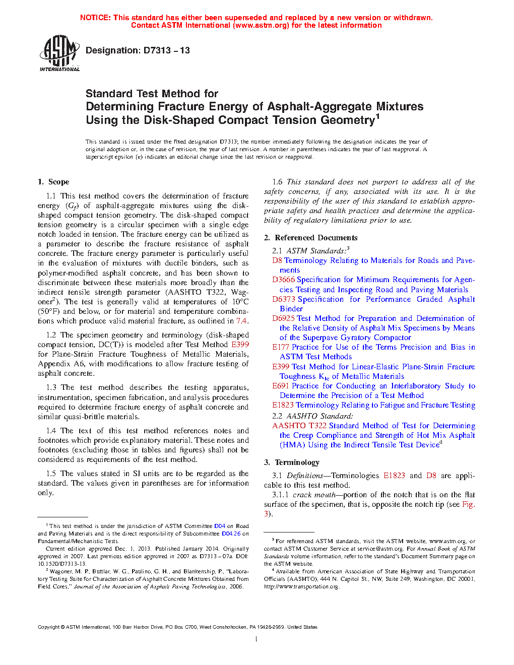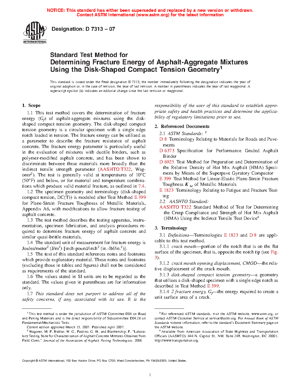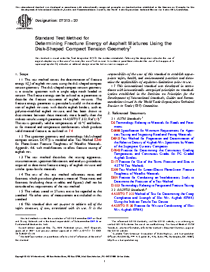 1.1 This test method covers the determination of fracture energy (Gf) of asphalt mixtures using the disk-shaped compact tension geometry. The disk-shaped compact tension geometry is a circular specimen with a single edge notch loaded in tension. The fracture energy can be utilized as a parameter to describe the fracture resistance of asphalt mixtures. The fracture energy parameter is particularly useful in the evaluation of asphalt mixtures with ductile asphalt binders, such as polymer-modified asphalt mixture, and has been shown to discriminate between these materials more broadly than the indirect tensile strength parameter (AASHTO T 322, Ref (1)).2 The test is generally valid at temperatures of 10 °C and below, or for material and temperature combinations which produce valid material fracture, as outlined in 7.4.