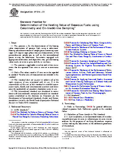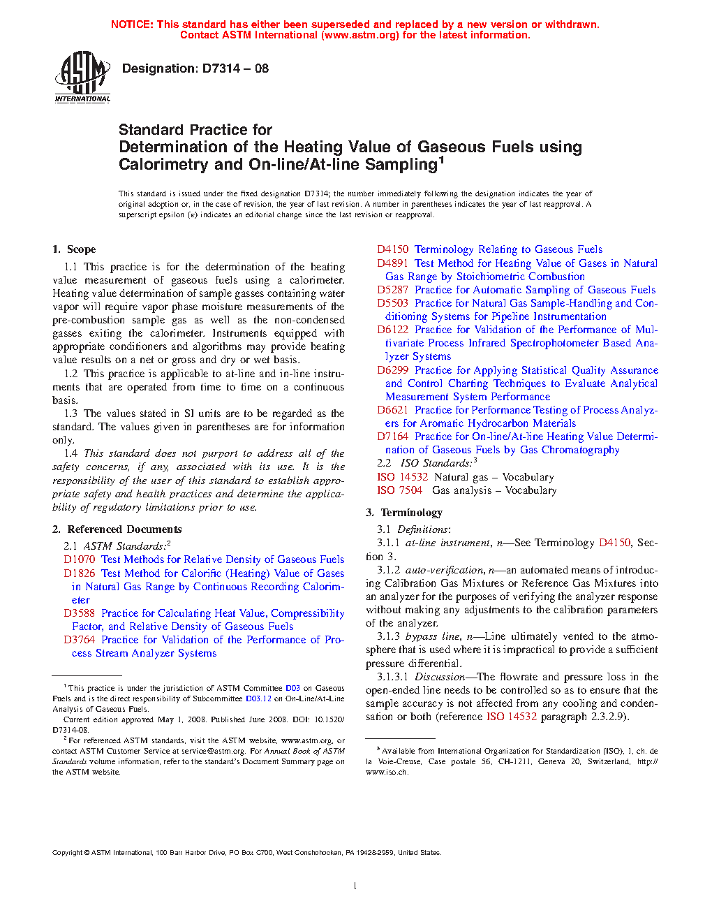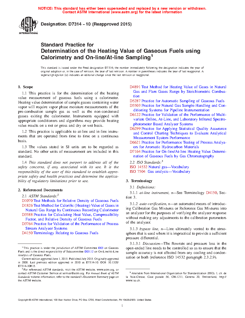 On-line, at-line, in-line and other near-real time monitoring systems that measure fuel gas characteristics such as heating value are prevalent in various gaseous fuel industries and in industries either producing or using gaseous fuel in their industrial processes. The installation and operation of particular systems vary depending on process type, regulatory requirements, and the user’s objectives and performance requirements. This practice is intended to provide guidance for standardized start-up procedures, operating procedures, and quality assurance practices for calorimeter based on-line, at-line, in-line and other near-real time heating value monitoring systems. Users employing gas chromatographic based instrumentation for measurement of gaseous fuel heating value are referred to Practice D7164.