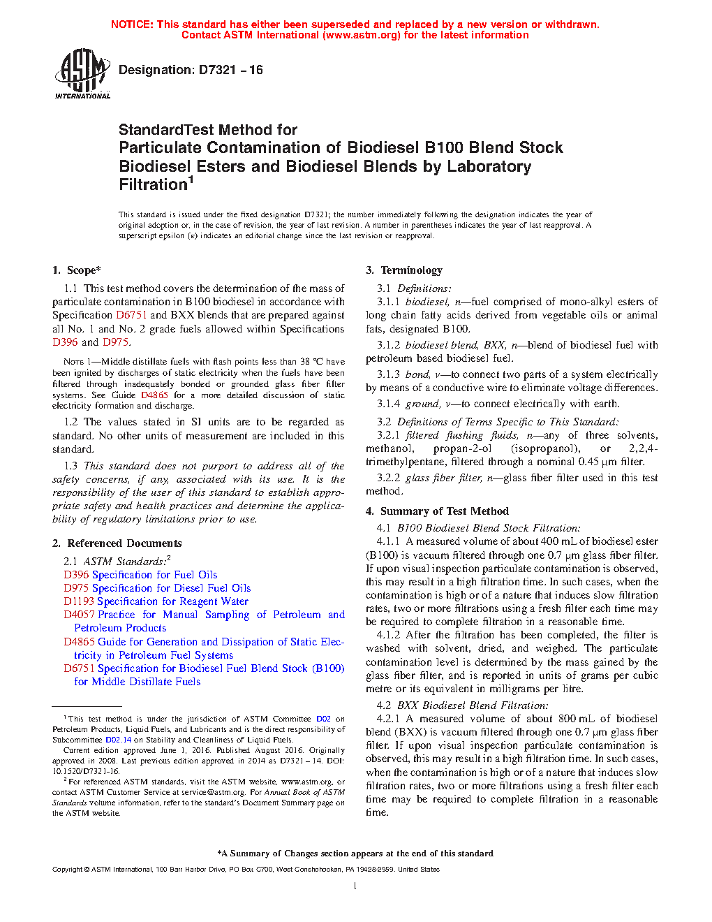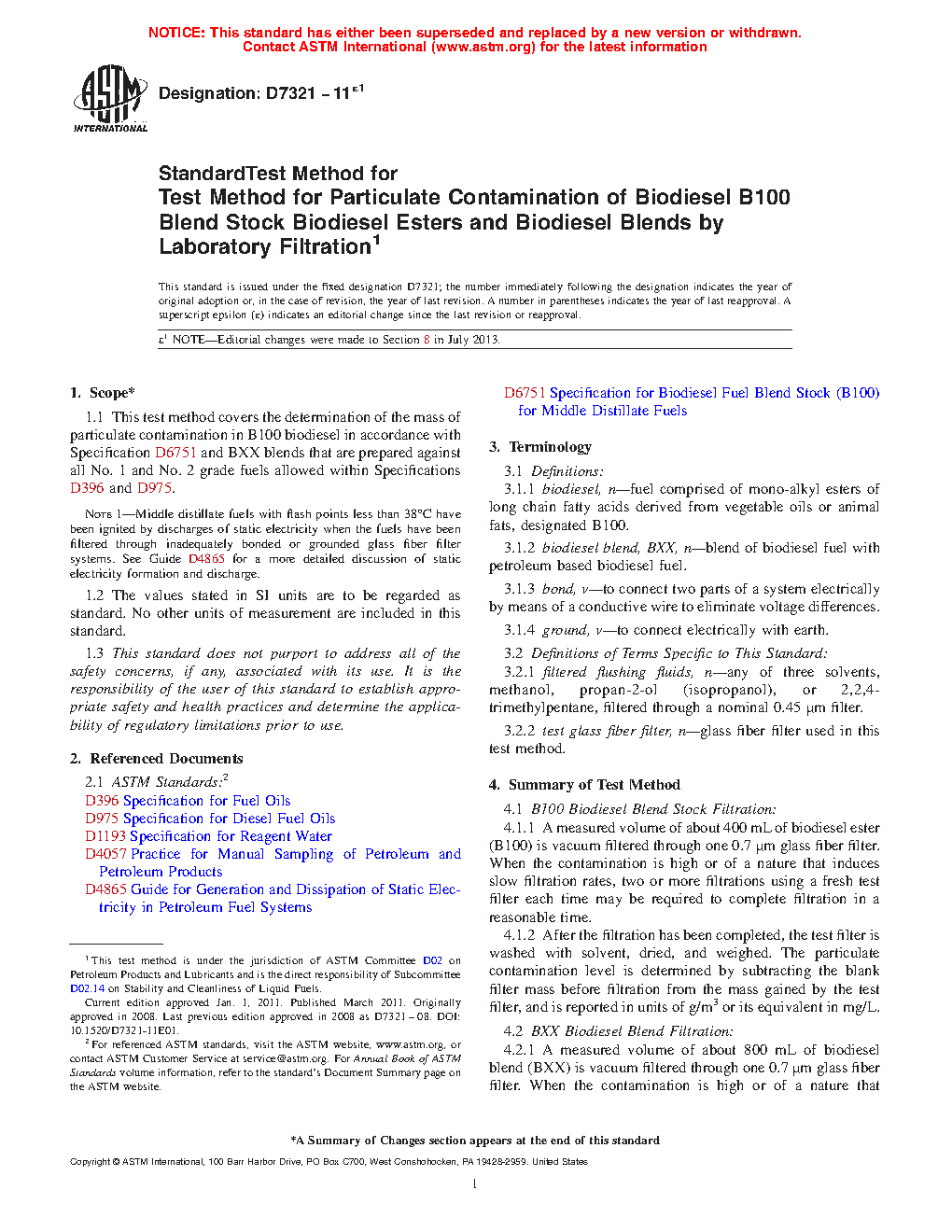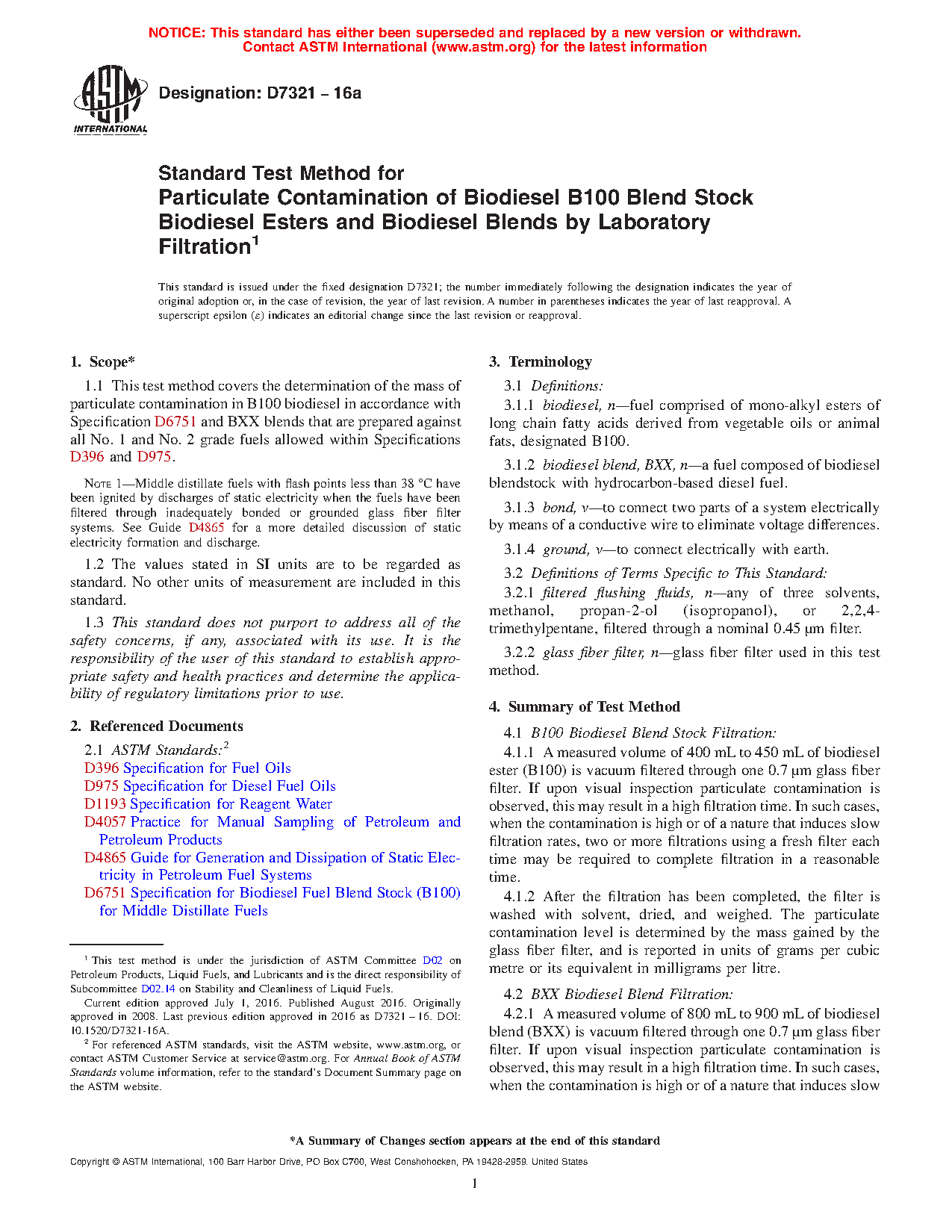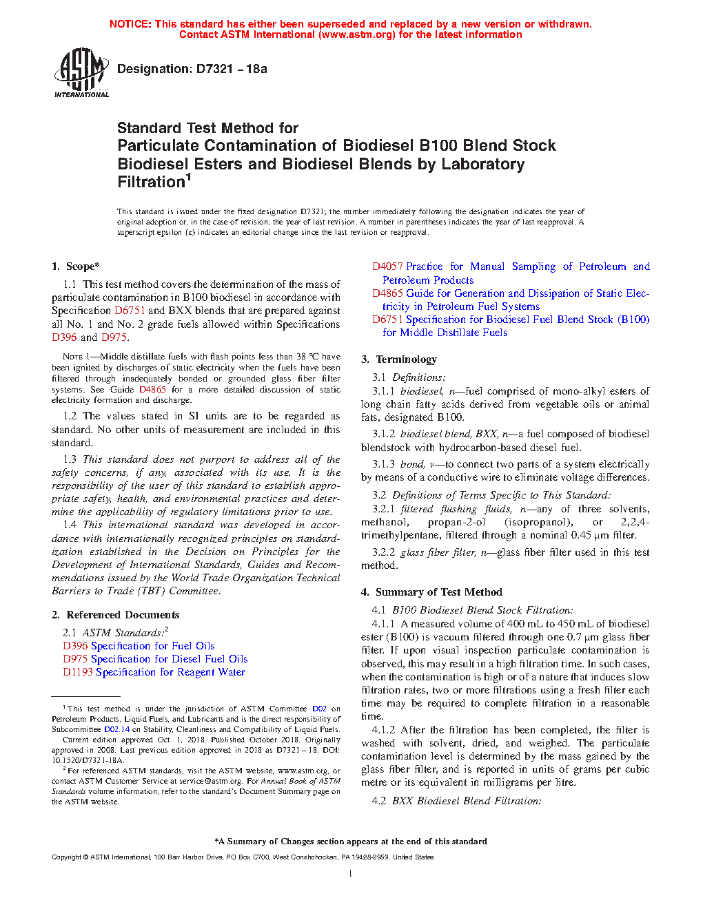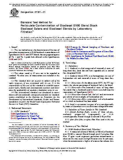 1.1 This test method covers the determination of the mass of particulate contamination in B100 biodiesel in accordance with Specification D6751 and BXX blends that are prepared against all No. 1 and No. 2 grade fuels allowed within Specifications D396 and D975.