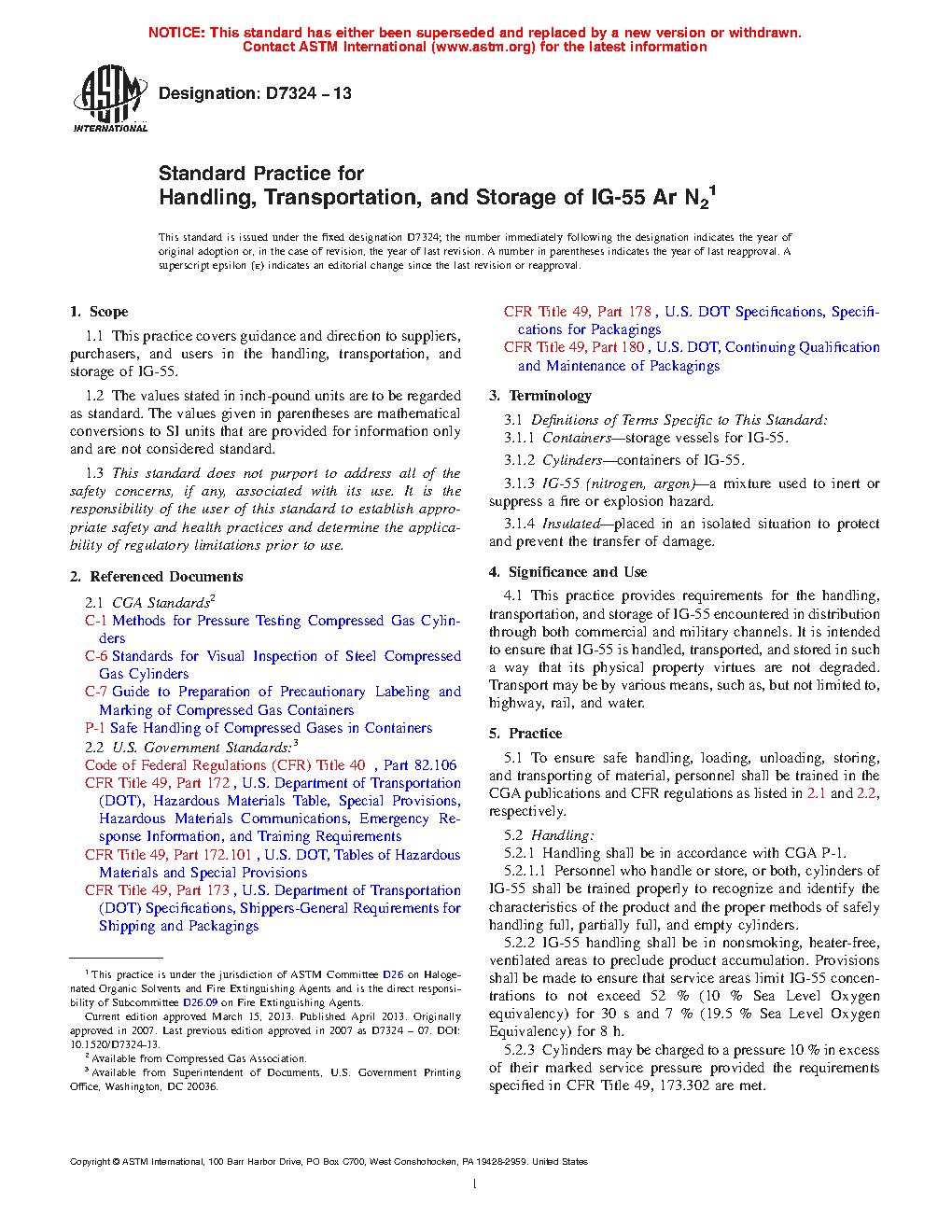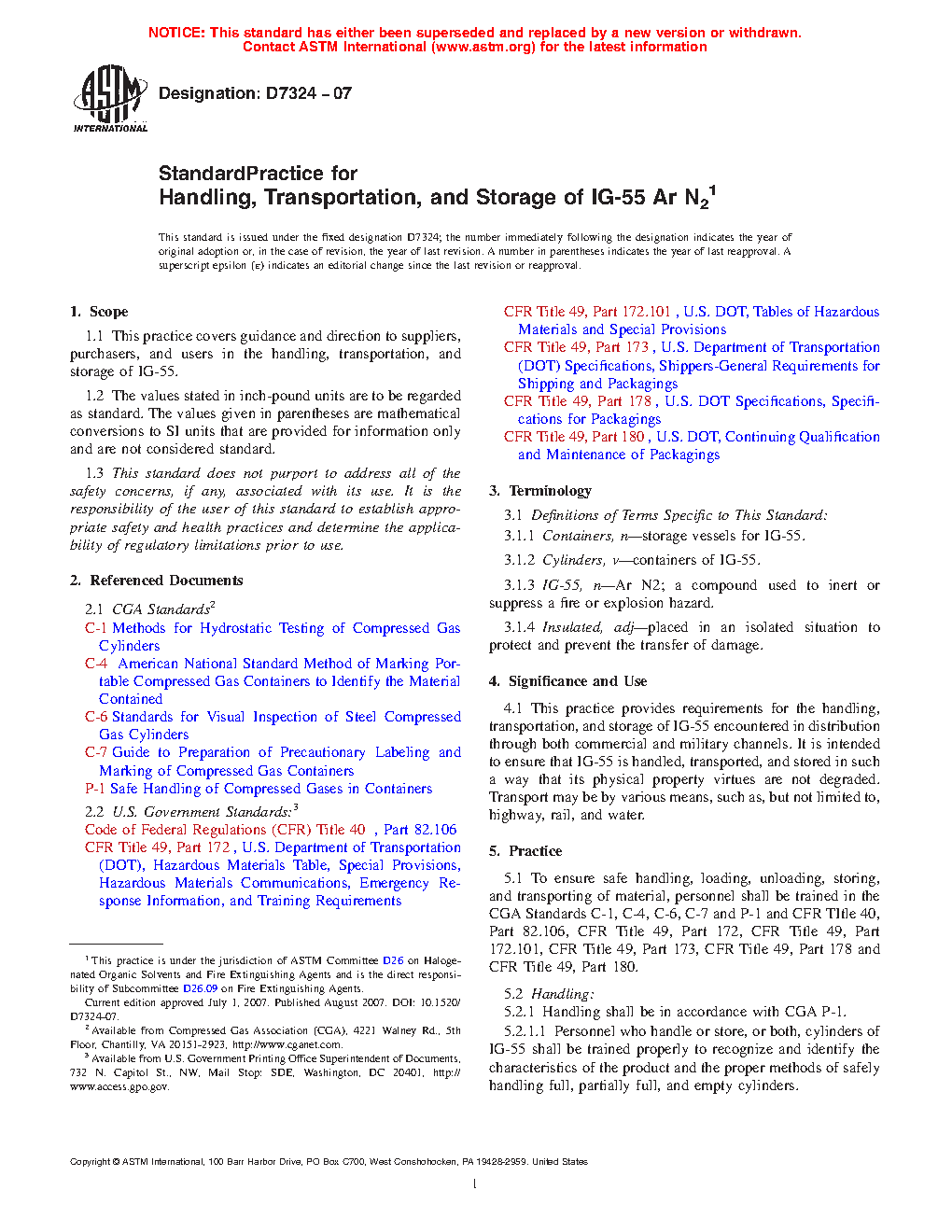 1.1 This practice covers guidance and direction to suppliers, purchasers, and users in the handling, transportation, and storage of IG-55.