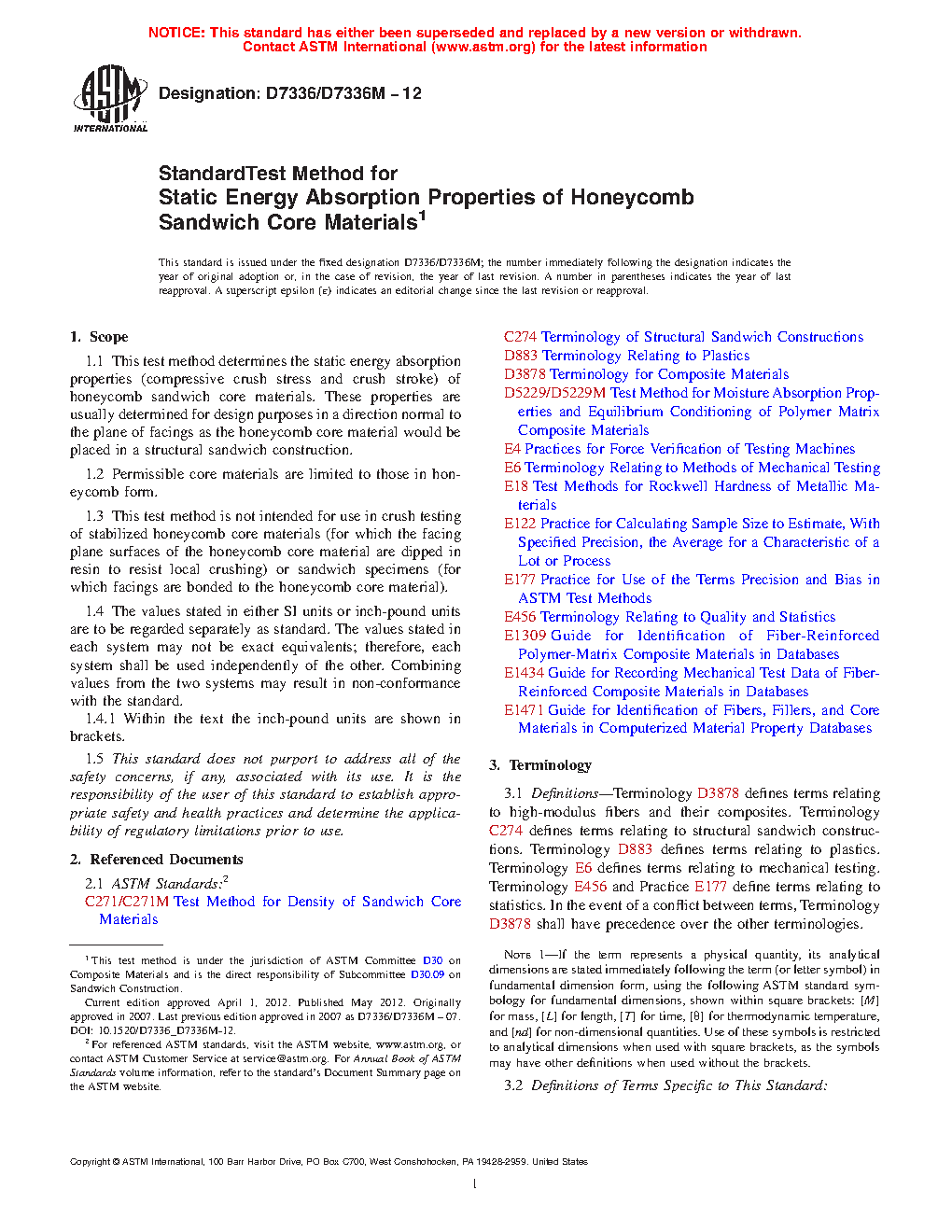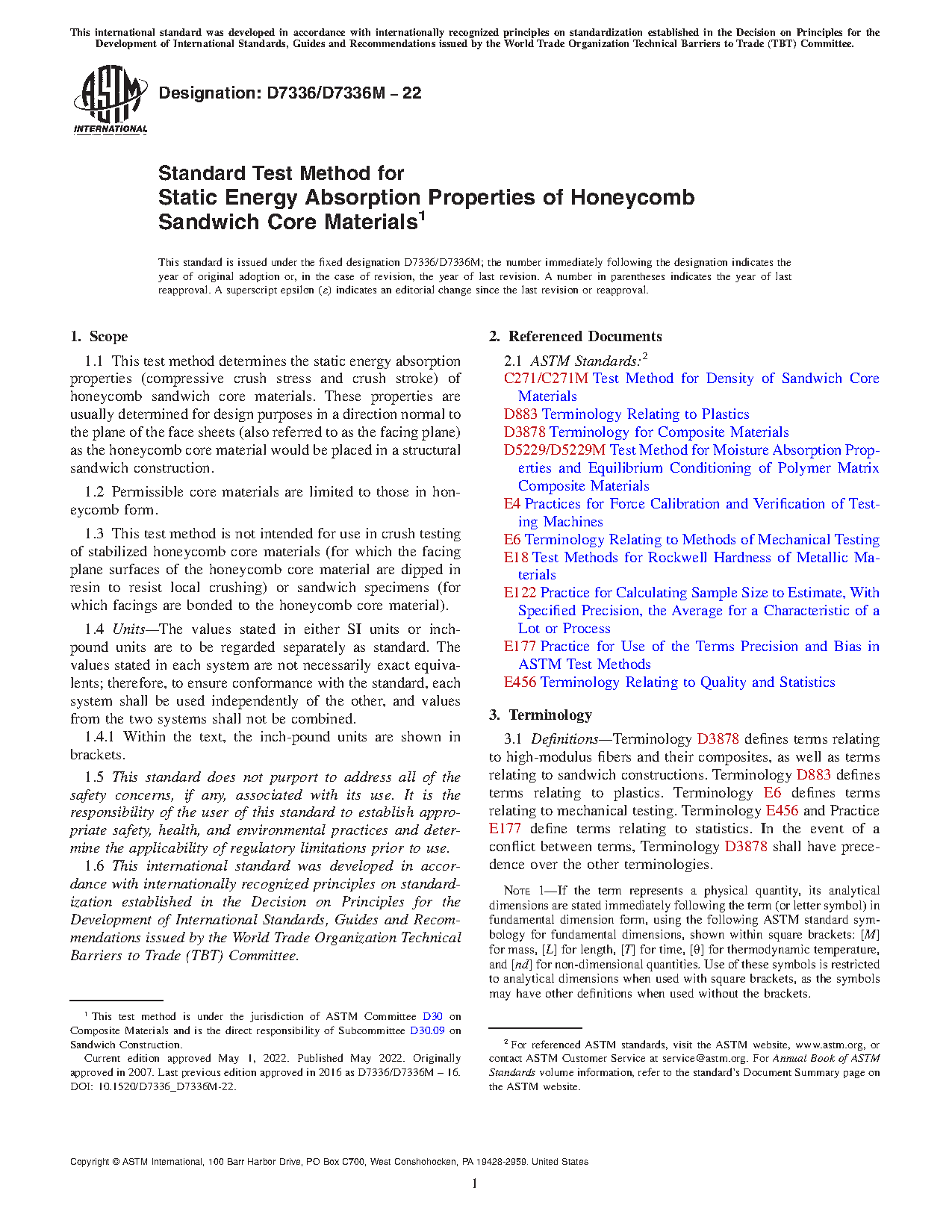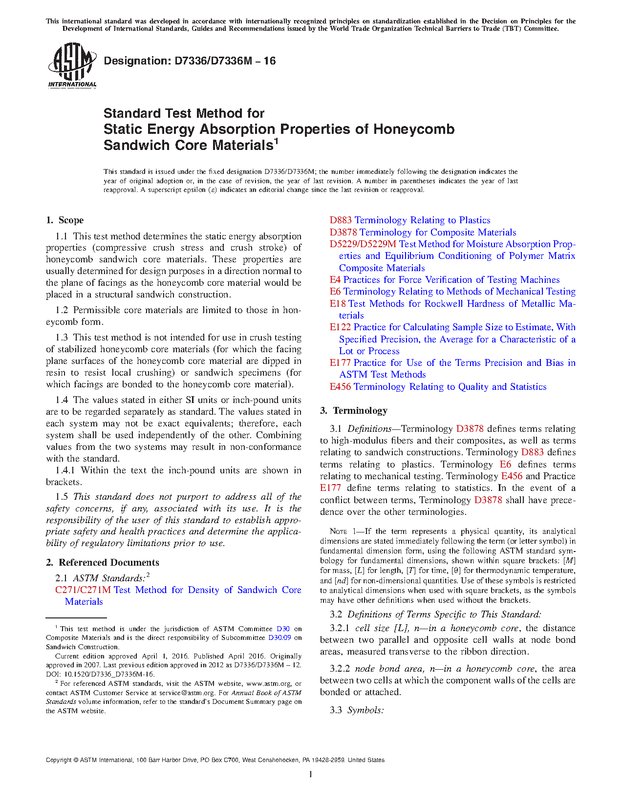 1.1 This test method determines the static energy absorption properties (compressive crush stress and crush stroke) of honeycomb sandwich core materials. These properties are usually determined for design purposes in a direction normal to the plane of the face sheets (also referred to as the facing plane) as the honeycomb core material would be placed in a structural sandwich construction.
