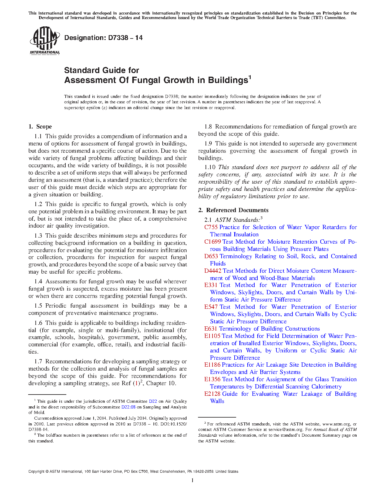 1.1 This guide provides a compendium of information and a menu of options for assessment of fungal growth in buildings, but does not recommend a specific course of action. Due to the wide variety of fungal problems affecting buildings and their occupants, and the wide variety of buildings, it is not possible to describe a set of uniform steps that will always be performed during an assessment (that is, a standard practice); therefore the user of this guide must decide which steps are appropriate for a given situation or building.