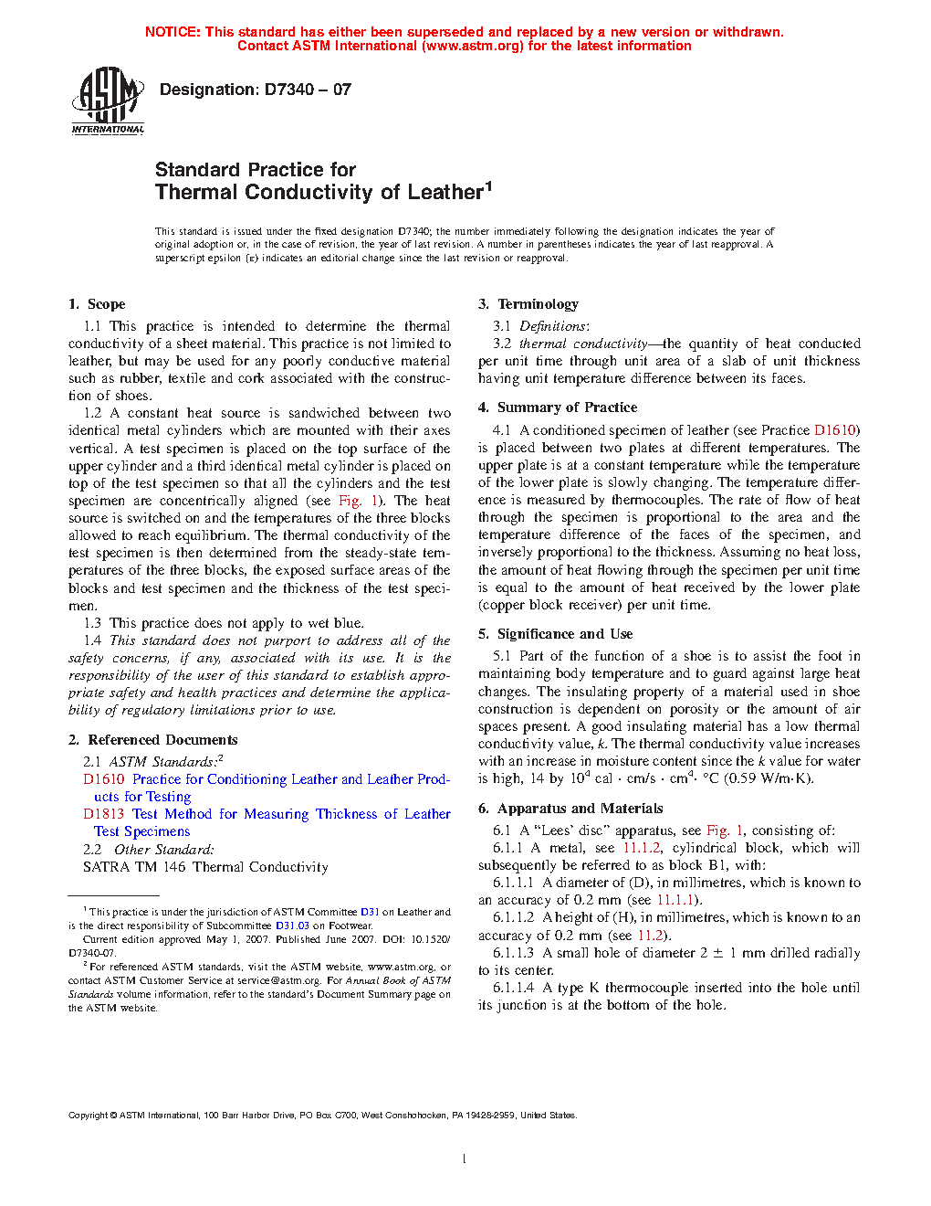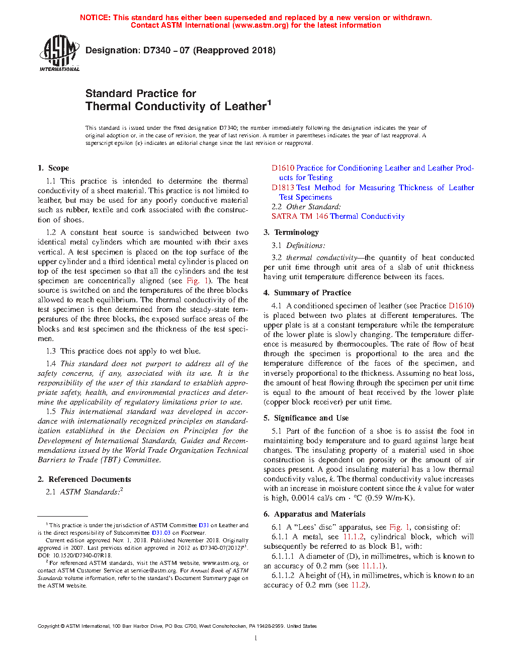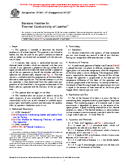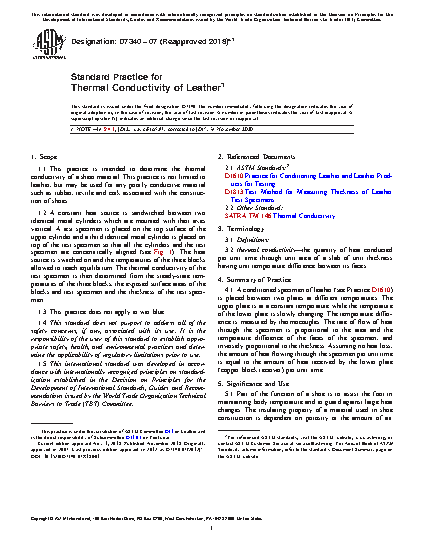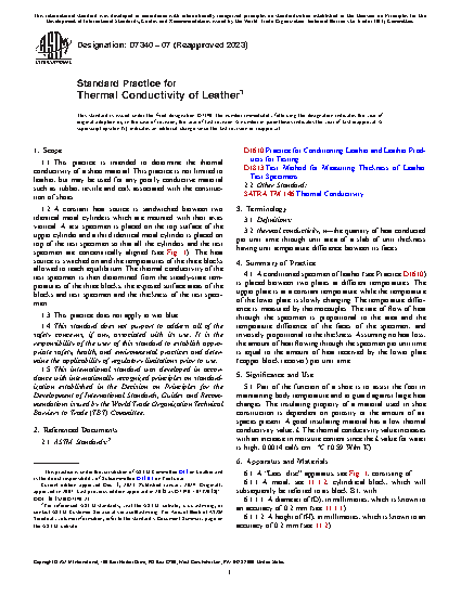 1.1 This practice is intended to determine the thermal conductivity of a sheet material. This practice is not limited to leather, but may be used for any poorly conductive material such as rubber, textile and cork associated with the construction of shoes.