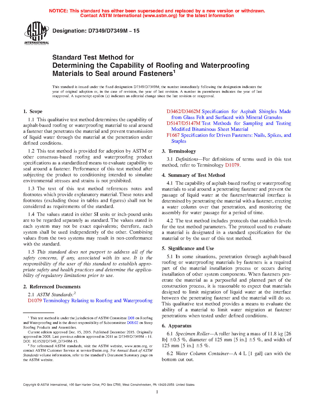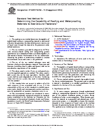 1.1 This qualitative test method determines the capability of asphalt-based roofing or waterproofing material to seal around a fastener that penetrates the material and prevent transmission of liquid water through the material at the penetration under defined conditions.