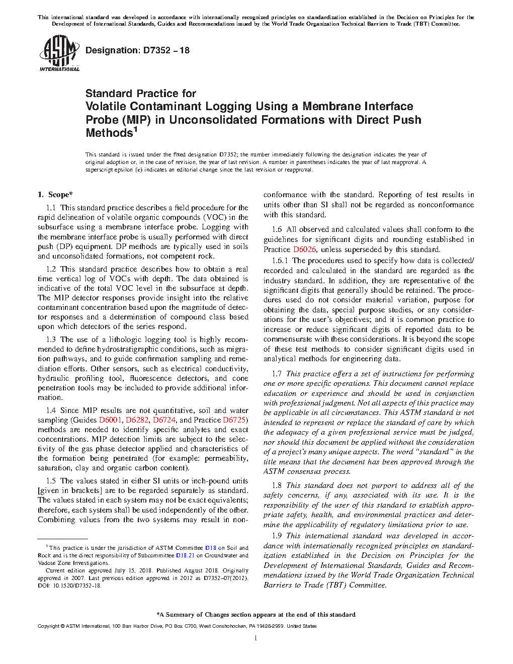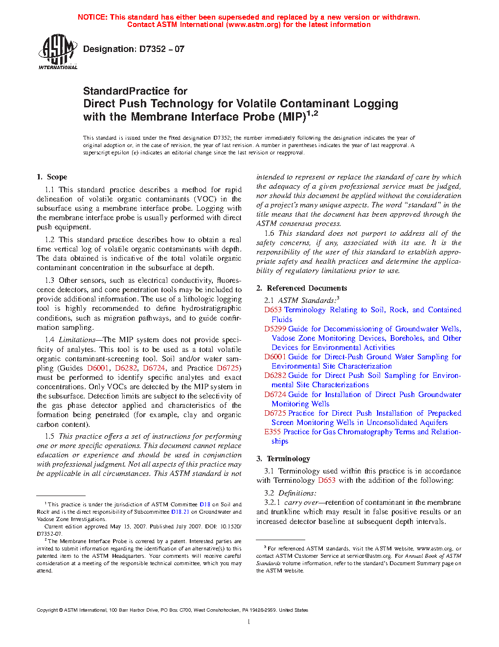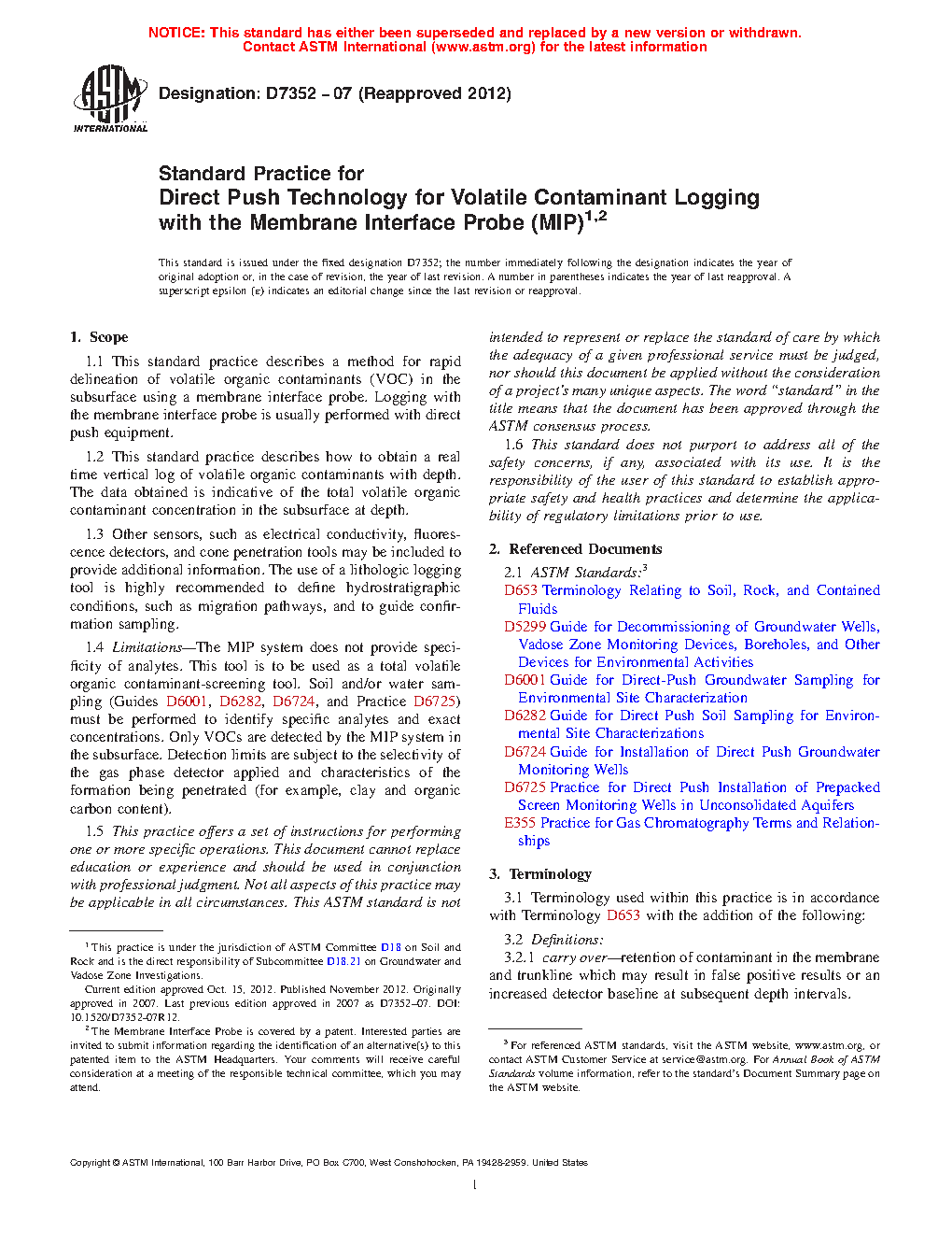 1.1 This standard practice describes a field procedure for the rapid delineation of volatile organic compounds (VOC) in the subsurface using a membrane interface probe. Logging with the membrane interface probe is usually performed with direct push (DP) equipment. DP methods are typically used in soils and unconsolidated formations, not competent rock.