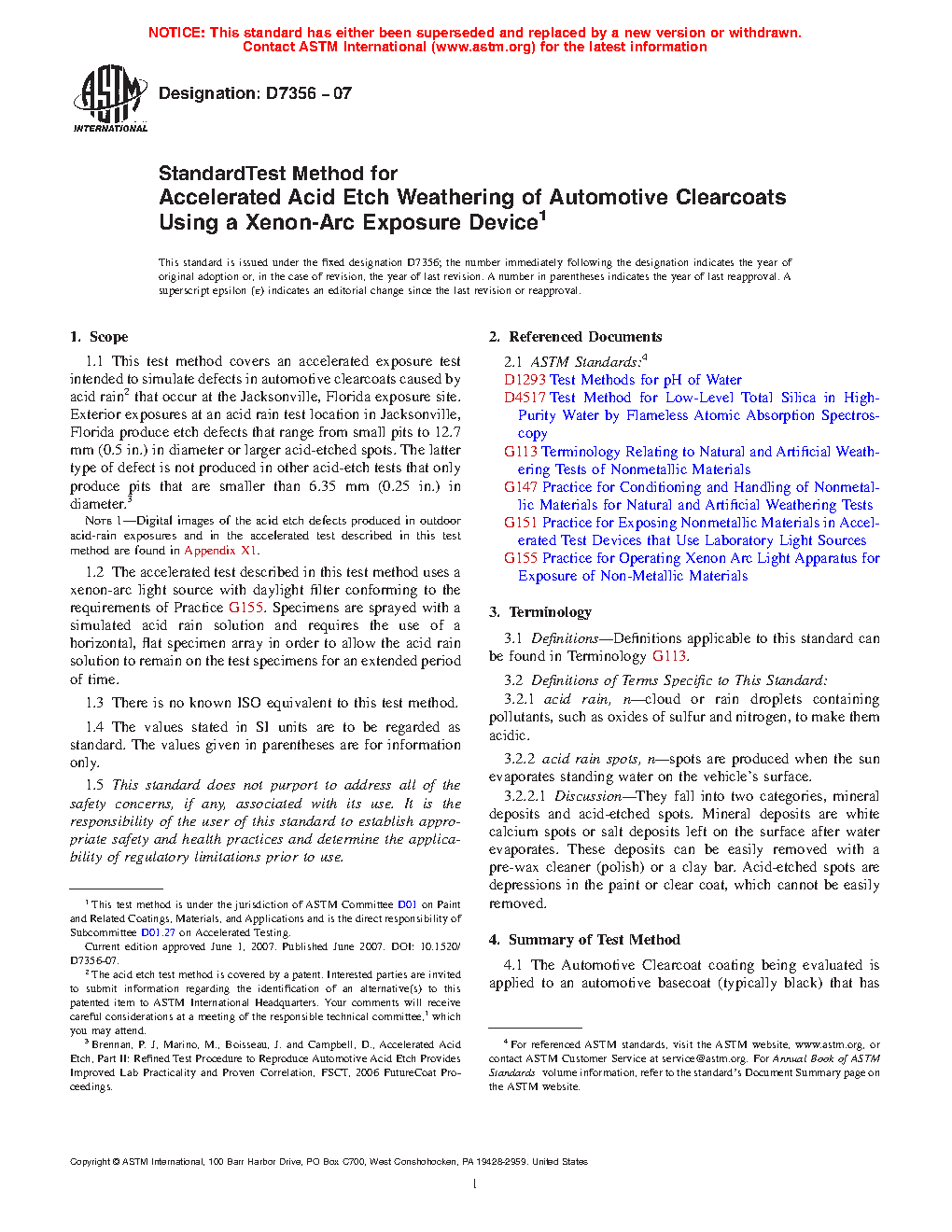 1.1 This test method covers an accelerated exposure test intended to simulate defects in automotive clearcoats caused by acid rain2 that occur at the Jacksonville, Florida exposure site. Exterior exposures at an acid rain test location in Jacksonville, Florida produce etch defects that range from small pits to 12.7 mm [0.5 in.] in diameter or larger acid-etched spots. The latter type of defect is not produced in other acid-etch tests that only produce pits that are smaller than 6.35 mm [0.25 in.] in diameter.3