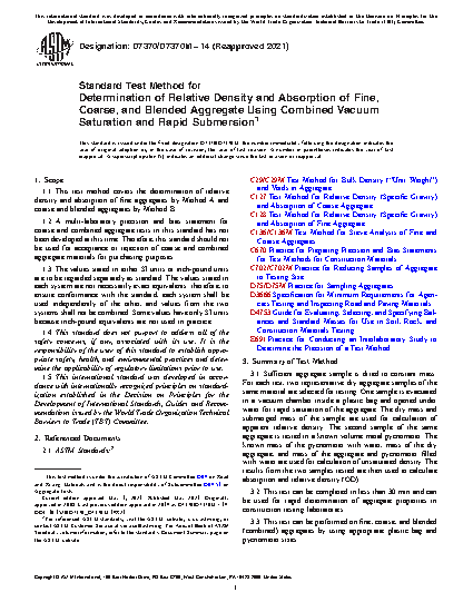 1.1 This test method covers the determination of relative density and absorption of fine aggregates by Method A and coarse and blended aggregates by Method B.