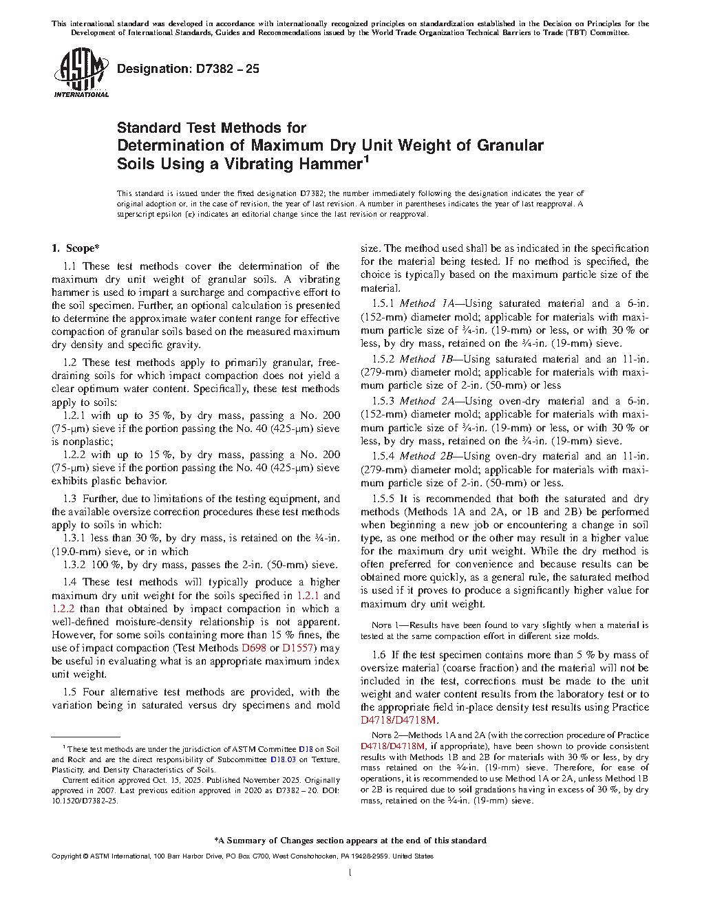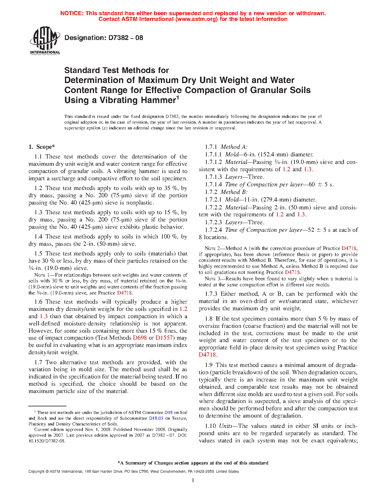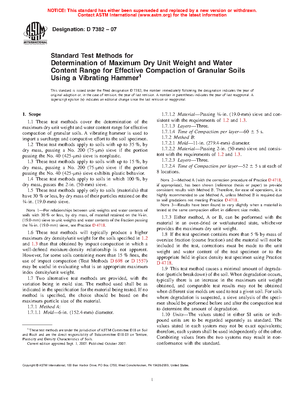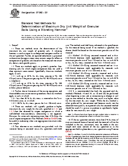 1.1 These test methods cover the determination of the maximum dry unit weight of granular soils. A vibrating hammer is used to impart a surcharge and compactive effort to the soil specimen. Further, an optional calculation is presented to determine the approximate water content range for effective compaction of granular soils based on the measured maximum dry density and specific gravity.