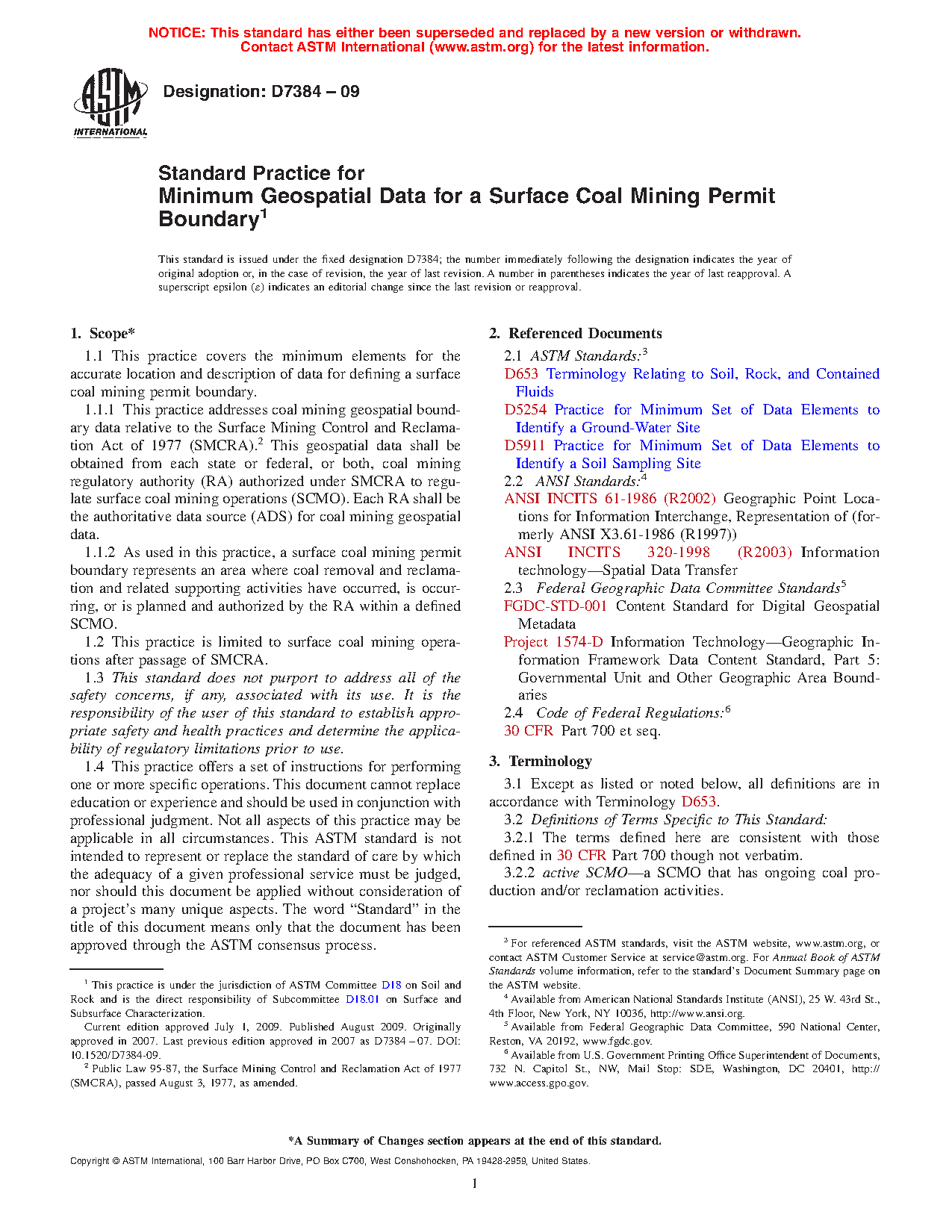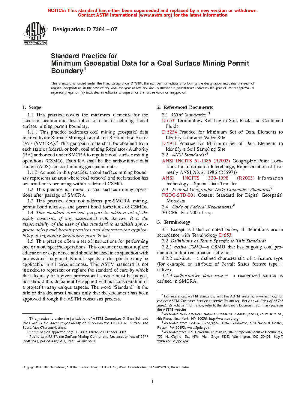 1.1.1 This practice addresses coal mining geospatial data relative to the Surface Mining Control and Reclamation Act of 1977 (SMCRA). This geospatial data shall be obtained from each state or federal, or both, coal mining Regulatory Authority (RA) authorized under SMCRA to regulate coal surface mining operations (CSMO). Each RA shall be the authoritative data source (ADS) for coal mining geospatial data.