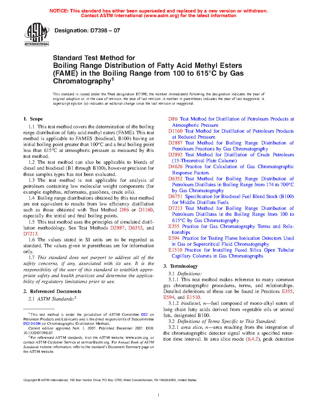 1.1 This test method covers the determination of the boiling range distribution of fatty acid methyl esters (FAME). This test method is applicable to FAMES (biodiesel, B100) having an initial boiling point greater than 100C and a final boiling point less than 615C at atmospheric pressure as measured by this test method.