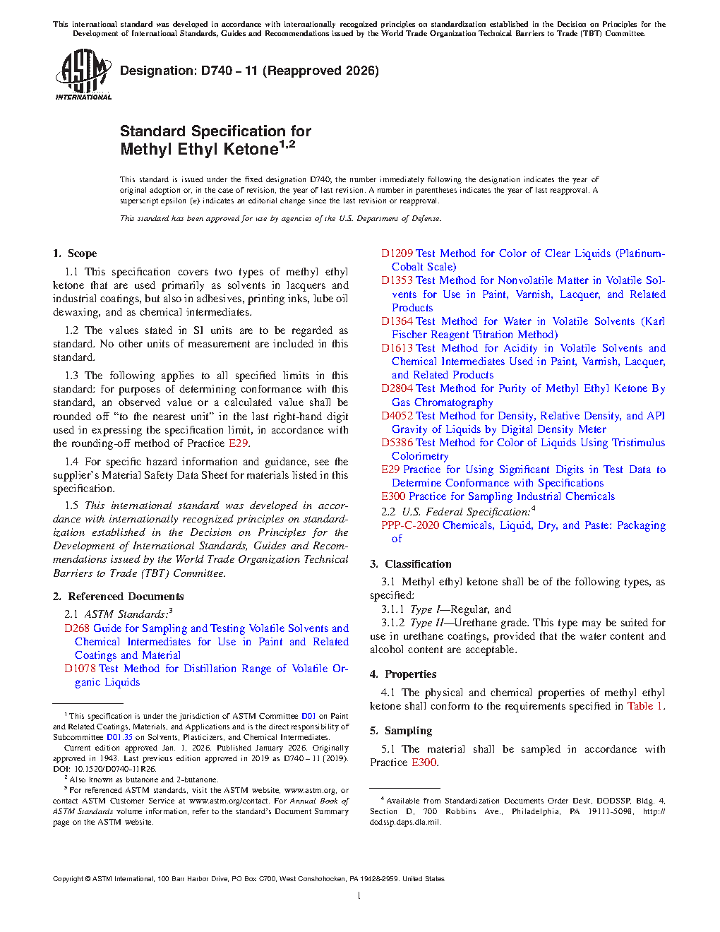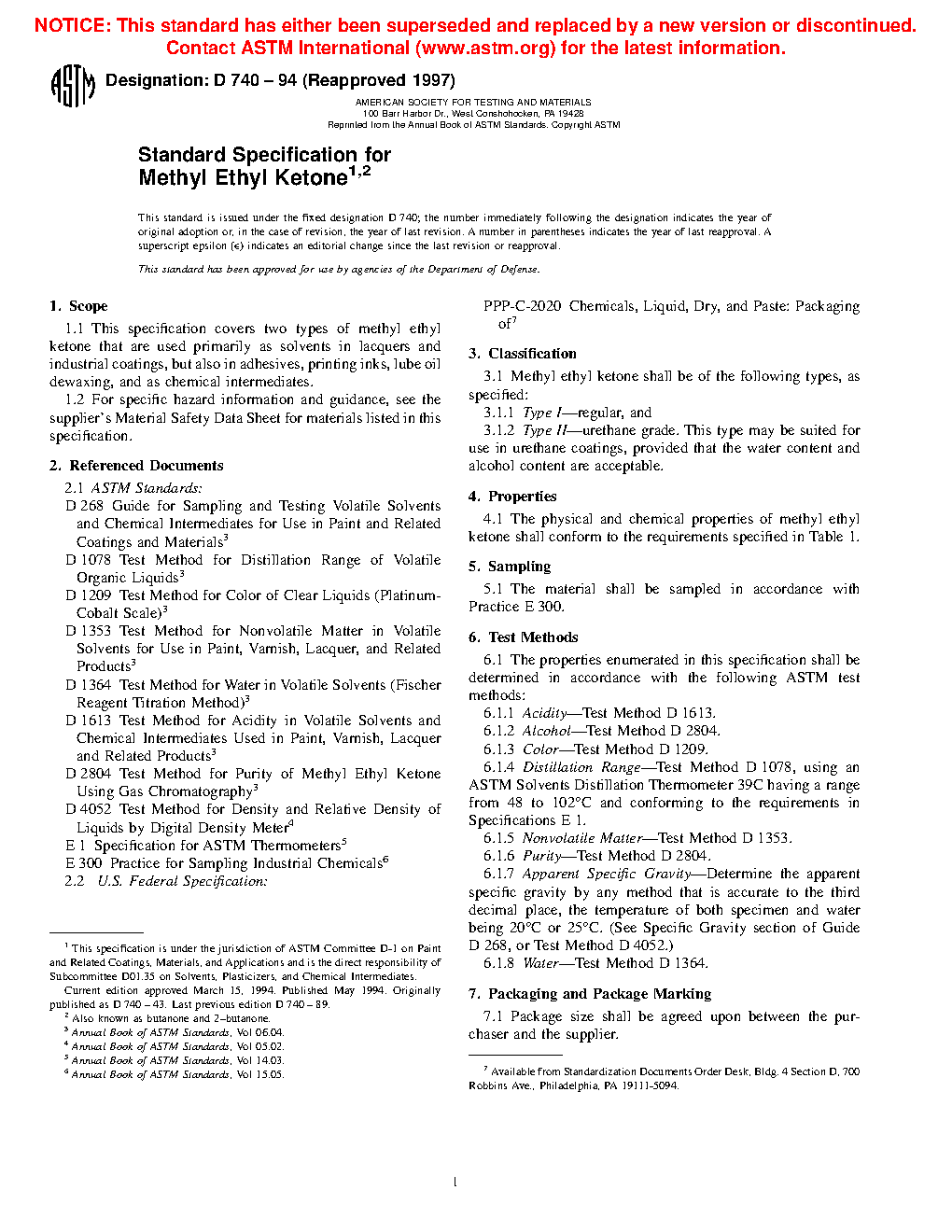 This specification covers two types of methyl ethyl ketone (or 2-butanone), namely: Type I (regular grade) and Type II (urethane grade), that are used primarily as solvents in lacquers and industrial coatings, but also in adhesives, printing inks, lube oil dewaxing, and as chemical intermediates. The physical and chemical properties of methyl ethyl ketone shall conform to the requirements specified for the following: (1) acidity, (2) weight percentage of alcohol, (3) color (Pt-Co scale), (4) distillation range defined by the initial boiling point and dry point, (5) nonvolatile matter content, (6) purity, (7) apparent specific gravity, and (8) weight percentage of water. The sampling and test methods for determining conformance to the specified physical and chemical properties are given.