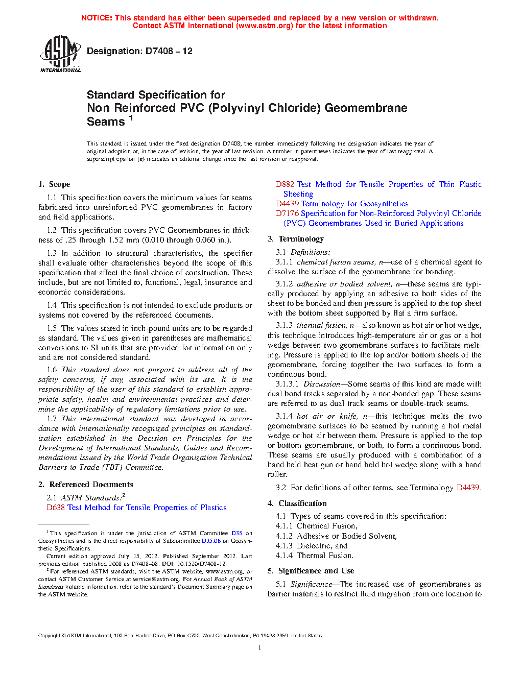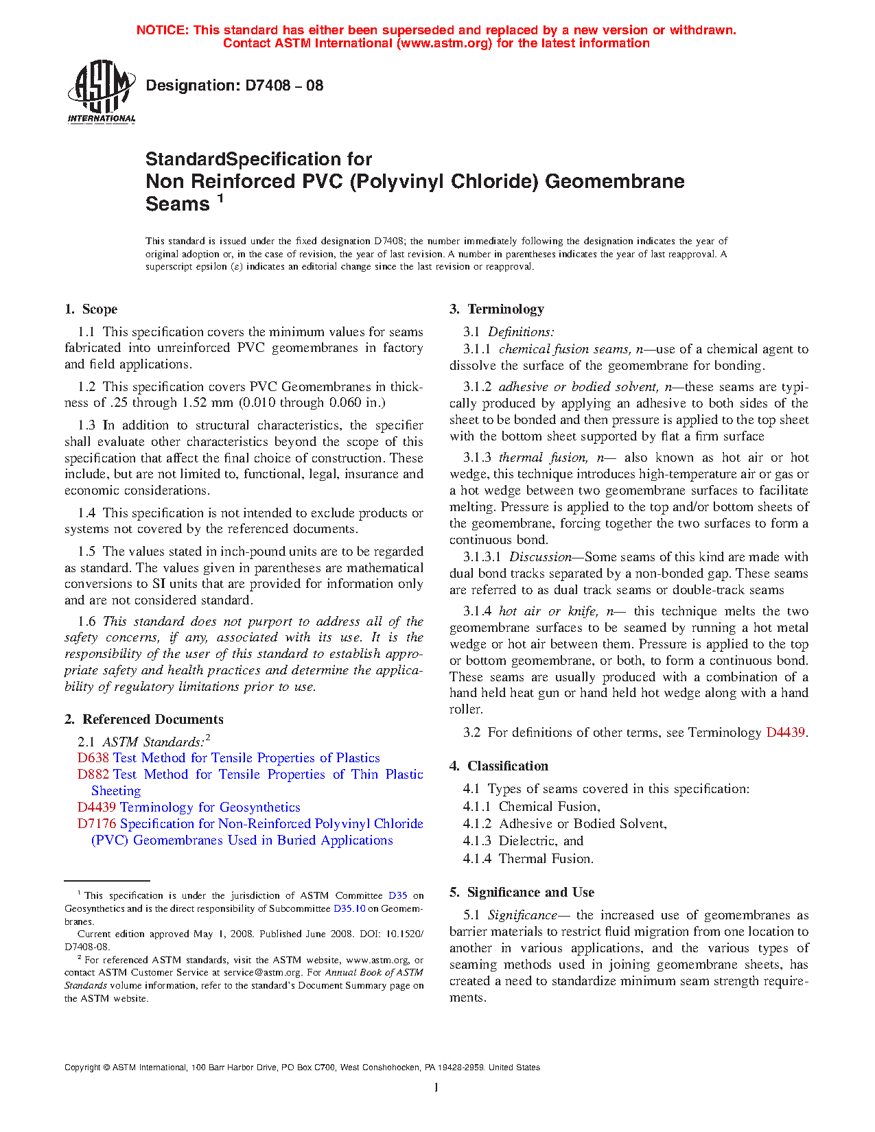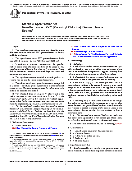 1.1 This specification covers the minimum values for seams fabricated into unreinforced PVC geomembranes in factory and field applications.