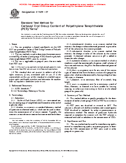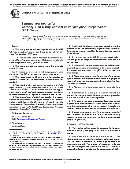 1.2 This test method is used to determine the concentration, in mmol/Kg, of carboxyl end groups (CEG) found in poly(ethylene terephthalate) (PET) yarns by titration.