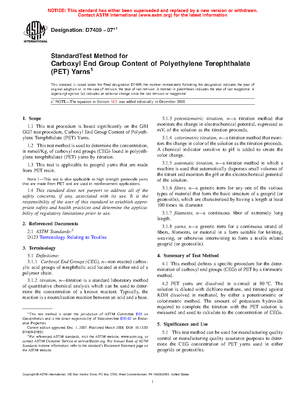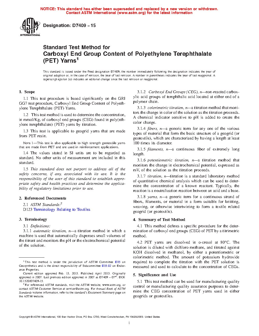 1.1 This test procedure is based significantly on the GRI GG7 test procedure, Carboxyl End Group Content of Polyethylene Terephthalate (PET) Yarns.