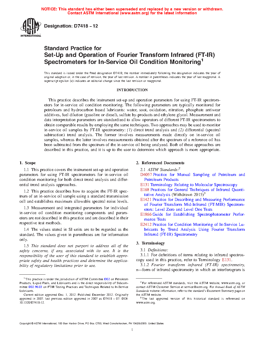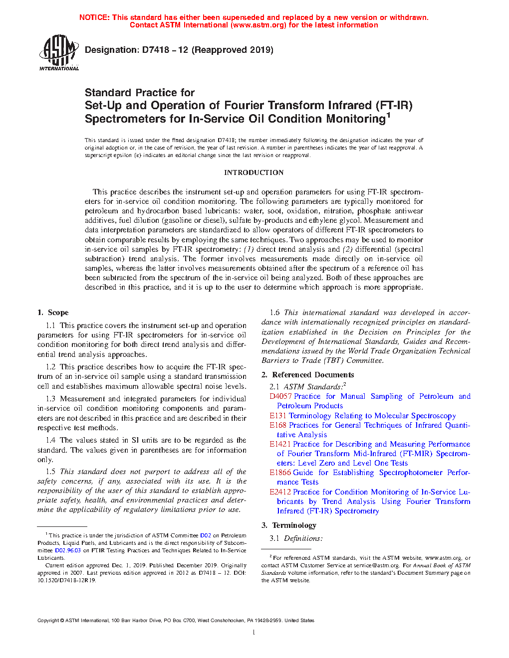 1.1 This practice covers the instrument set-up and operation parameters for using FT-IR spectrometers for in-service oil condition monitoring for both direct trend analysis and differential trend analysis approaches.