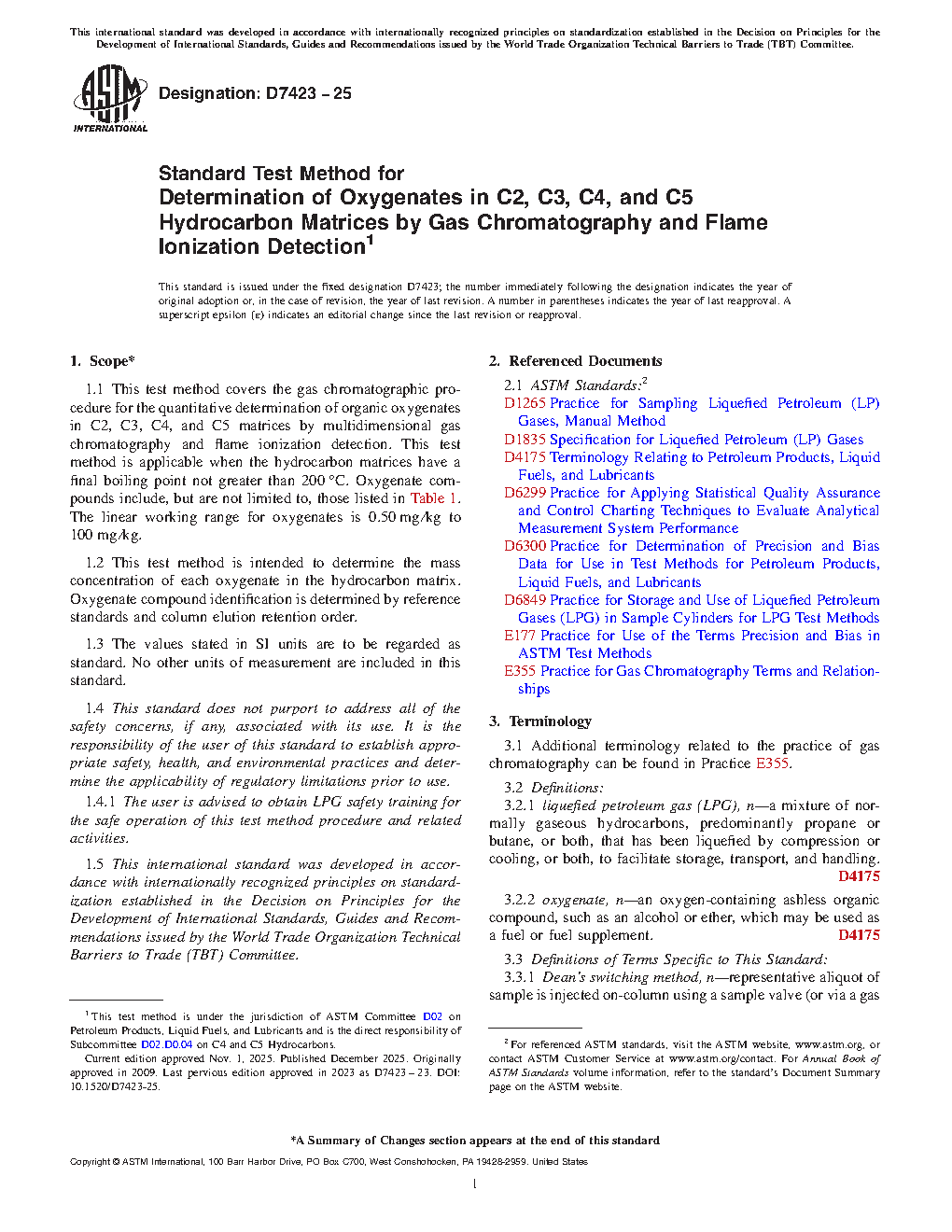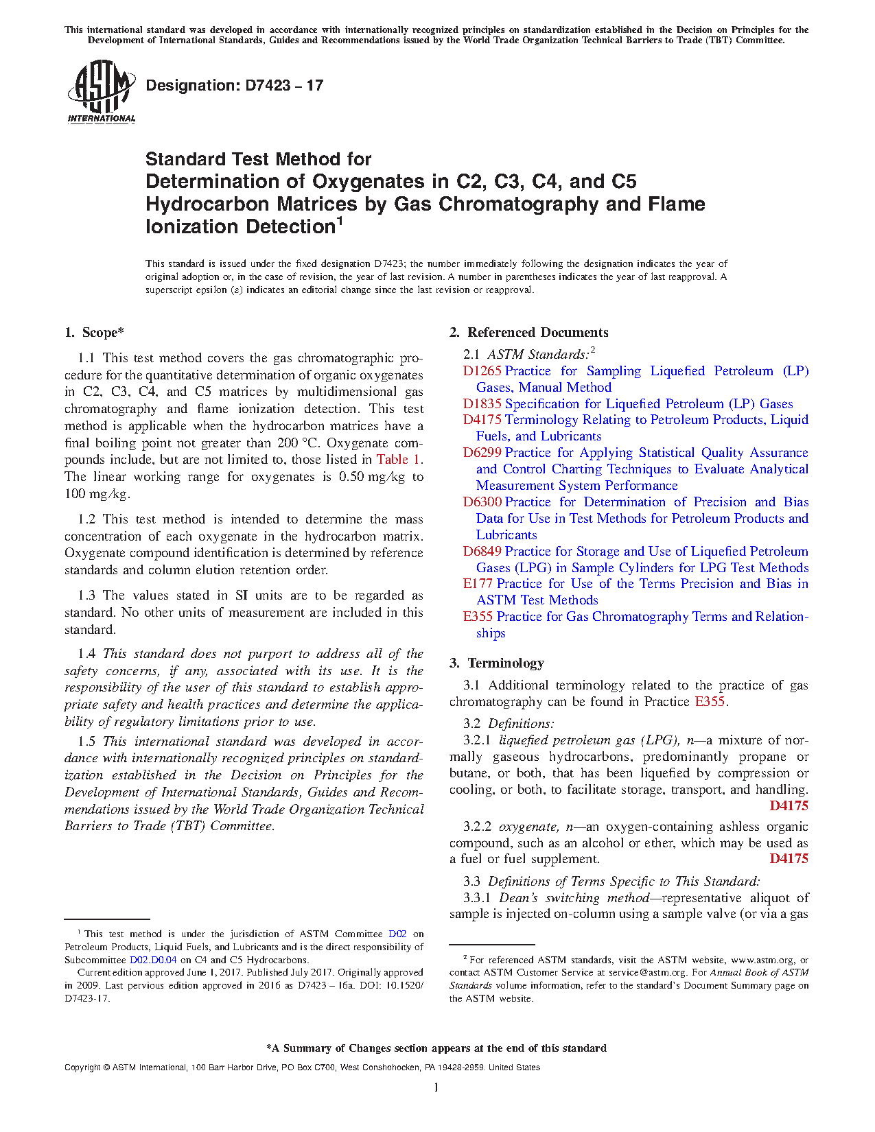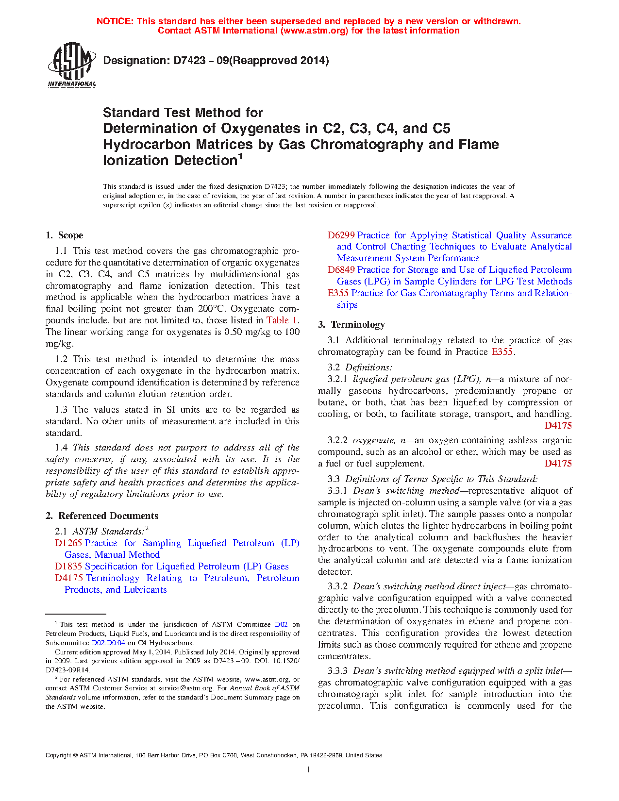 1.1 This test method covers the gas chromatographic procedure for the quantitative determination of organic oxygenates in C2, C3, C4, and C5 matrices by multidimensional gas chromatography and flame ionization detection. This test method is applicable when the hydrocarbon matrices have a final boiling point not greater than 200 °C. Oxygenate compounds include, but are not limited to, those listed in Table 1. The linear working range for oxygenates is 0.50 mg/kg to 100 mg/kg.