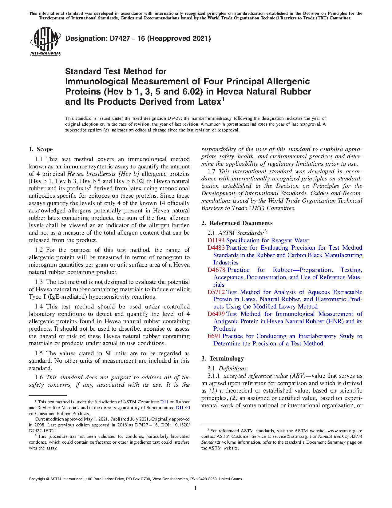 1.1 This test method covers an immunological method known as an immunoenzymetric assay to quantify the amount of 4 principal Hevea brasiliensis [Hev b] allergenic proteins [Hev b 1, Hev b 3, Hev b 5 and Hev b 6.02] in natural rubber and its products derived from latex using monoclonal antibodies specific for epitopes on these proteins. Since these assays quantify the levels of only 4 of the known 13 officially acknowledged allergens potentially present in natural rubber latex containing products, the sum of the four allergen levels shall be viewed as an indicator of the allergen burden and not as a measure of the total allergen content that can be released from the product.