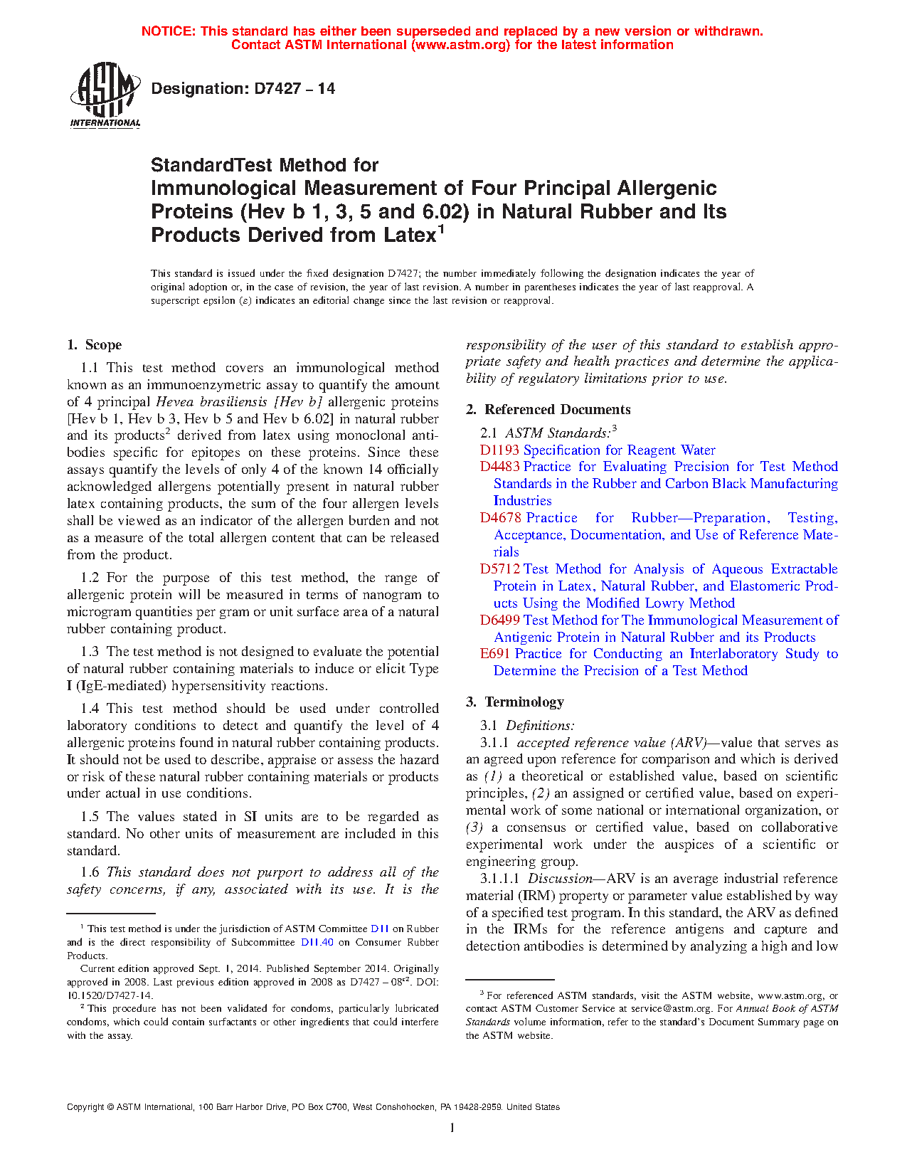 1.1 This test method covers an immunological method known as an immunoenzymetric assay to quantify the amount of 4 principal Hevea brasiliensis [Hev b] allergenic proteins [Hev b 1, Hev b 3, Hev b 5 and Hev b 6.02] in Hevea natural rubber and its products2 derived from latex using monoclonal antibodies specific for epitopes on these proteins. Since these assays quantify the levels of only 4 of the known 14 officially acknowledged allergens potentially present in Hevea natural rubber latex containing products, the sum of the four allergen levels shall be viewed as an indicator of the allergen burden and not as a measure of the total allergen content that can be released from the product.