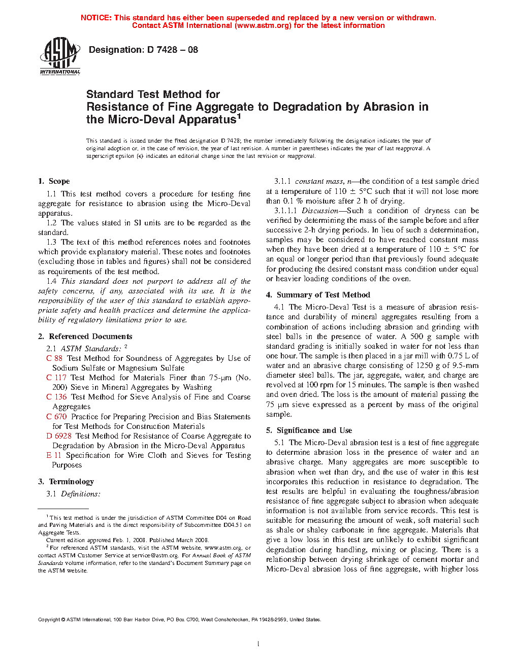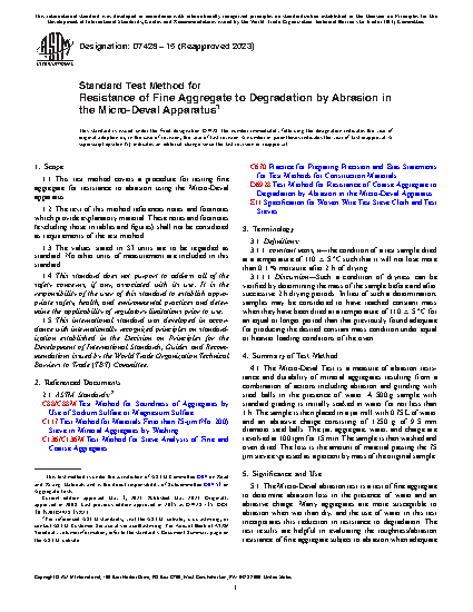 1.1 This test method covers a procedure for testing fine aggregate for resistance to abrasion using the Micro-Deval apparatus.