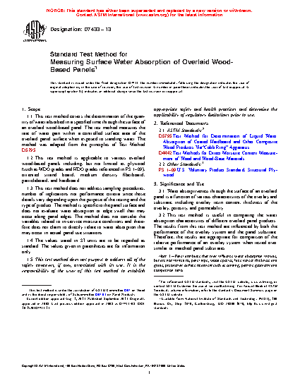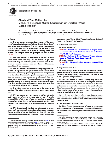 1.1 This test method covers the determination of the quantity of water absorbed in a specified time through the surface of an overlaid wood-based panel. The test method measures the rate of water gain within a controlled surface area of the overlaid panel surface when exposed to standing water. The method was adapted from the principles of Test Method D5795.