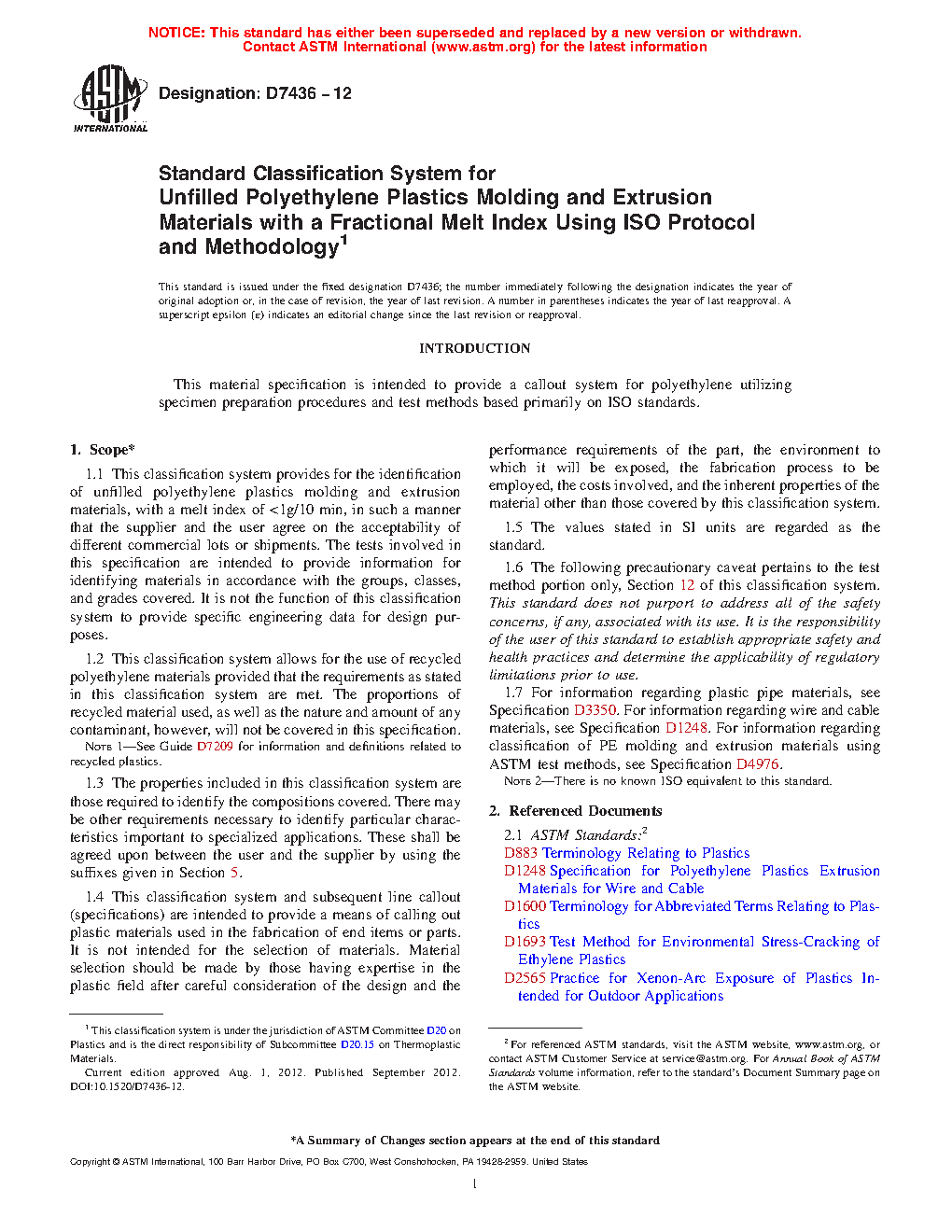 1.7 For information regarding plastic pipe materials, see Specification D3350. For information regarding wire and cable materials, see Specification D1248. For information regarding classification of PE molding and extrusion materials using ASTM test methods, see Specification D4976.