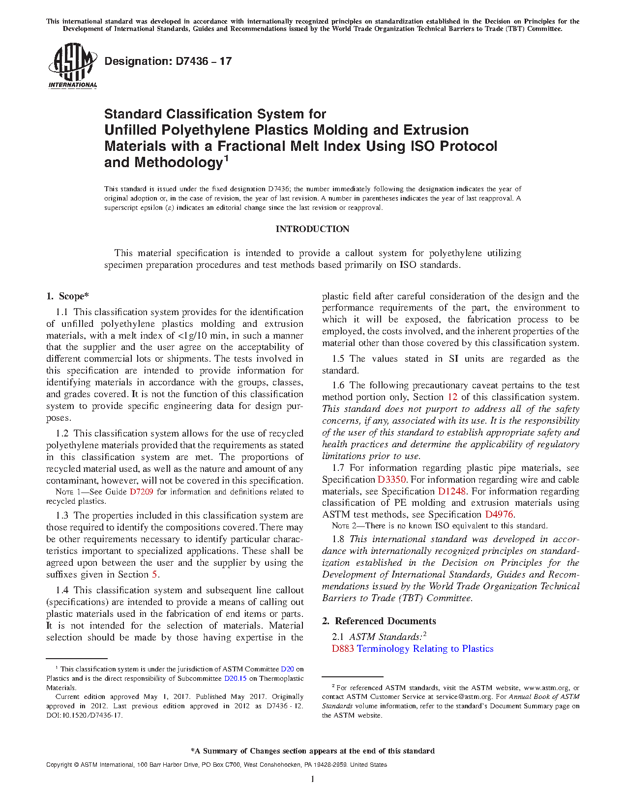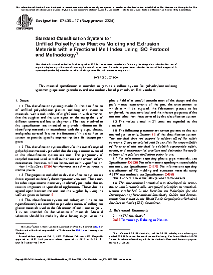 1.1 This classification system provides for the identification of unfilled polyethylene plastics molding and extrusion materials, with a melt index of <1g/10 min, in such a manner that the supplier and the user agree on the acceptability of different commercial lots or shipments. The tests involved in this specification are intended to provide information for identifying materials in accordance with the groups, classes, and grades covered. It is not the function of this classification system to provide specific engineering data for design purposes.