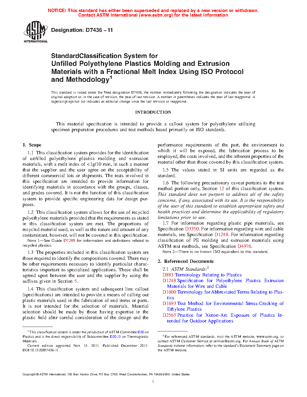 1.2 This classification system allows for the use of recycled polyethylene materials provided that the requirements as stated in this classification system are met. The proportions of recycled material used, as well as the nature and amount of any contaminant, however, will not be covered in this specification.