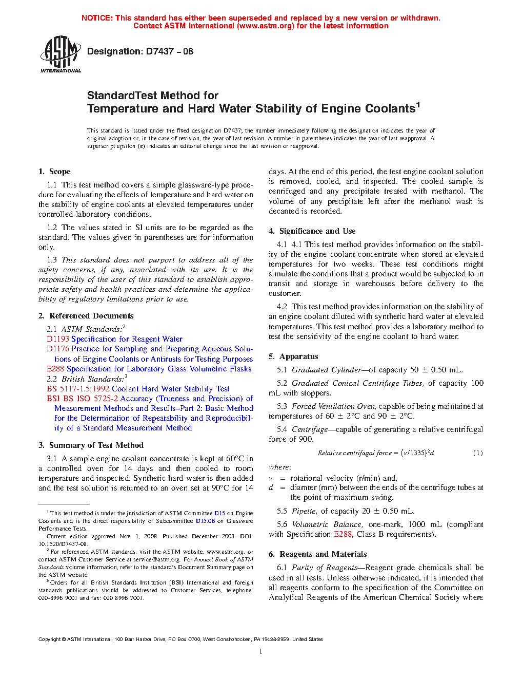 1.1 This test method covers a simple glassware-type procedure for evaluating the effects of temperature and hard water on the stability of engine coolants at elevated temperatures under controlled laboratory conditions.