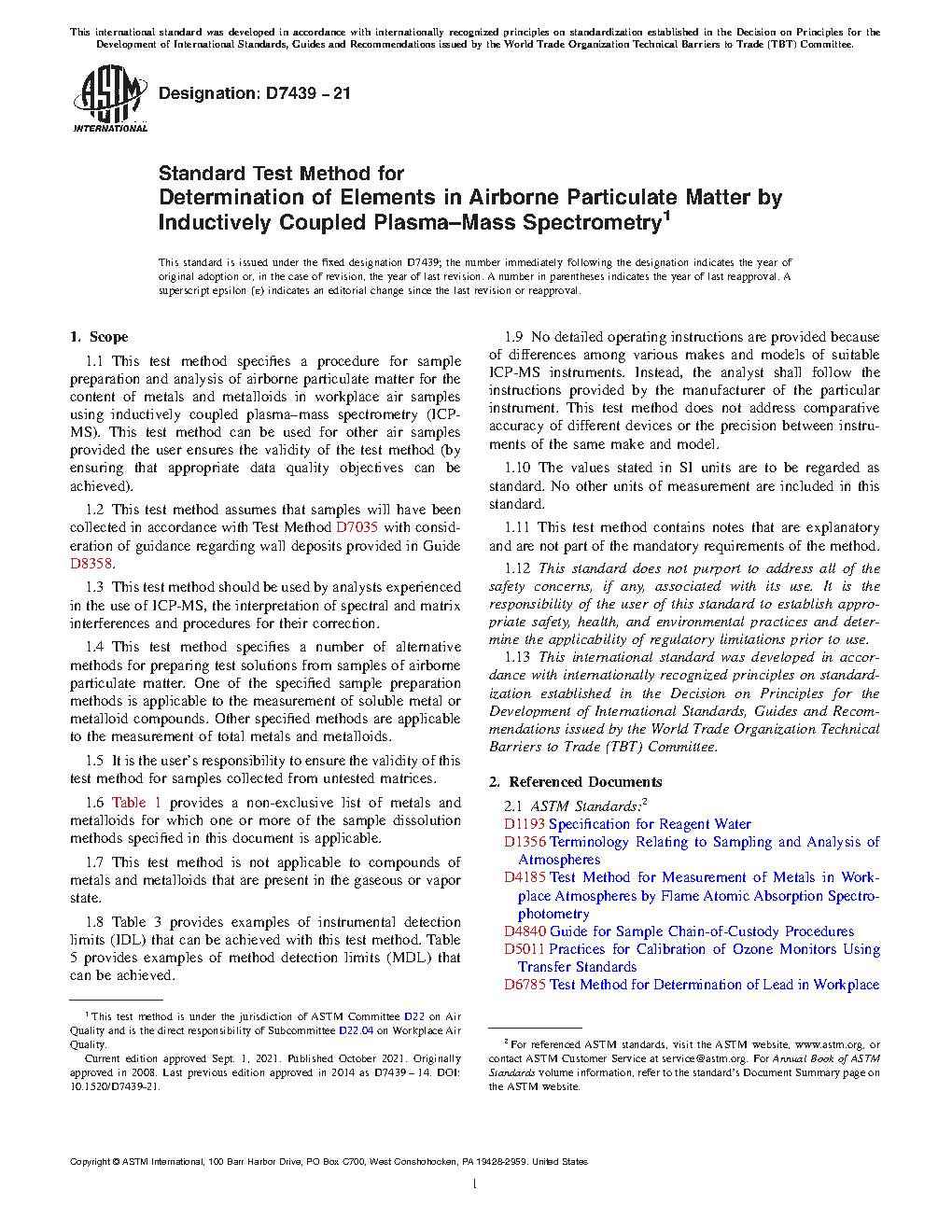 1.1 This standard test method specifies a procedure for sample preparation and analysis of airborne particulate matter for the content of metals and metalloids in workplace air samples using inductively coupled plasma–mass spectrometry (ICP-MS). This test method can be used for other air samples provided the user ensures the validity of the test method (by ensuring that appropriate data quality objectives can be achieved).