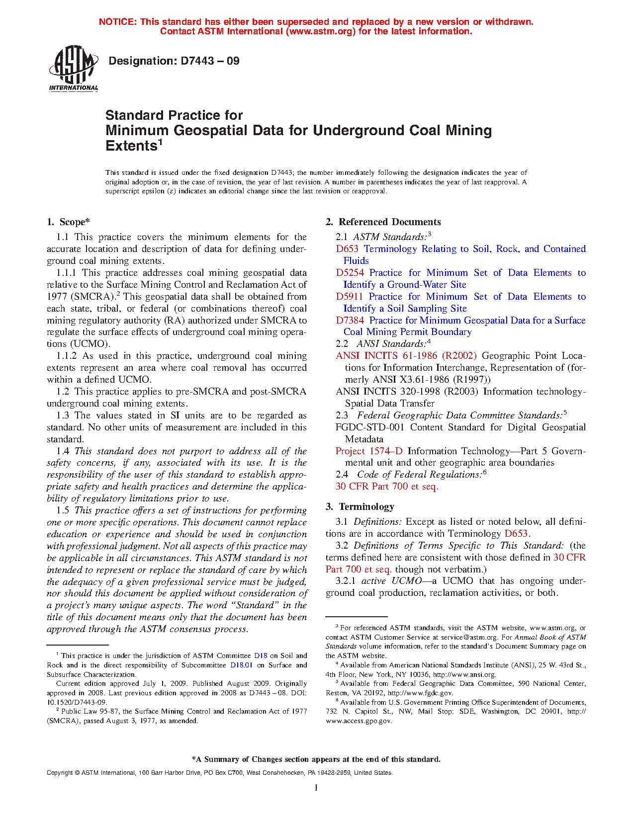 This practice addresses underground coal mining extent geospatial data relative to the Surface Mining Control and Reclamation Act of 1977 (SMCRA). This practice is significant to the coal mining community because it provides for uniformity of geospatial data pertaining to underground coal mine extents for mines located throughout the United States. These standards will help ensure uniformity of data contributed by each RA and assist organizations in future efforts to create and utilize geospatial data relative to underground coal mining extents in the United States. The first standard developed is Practice D 7384