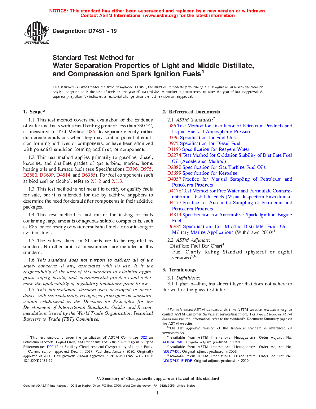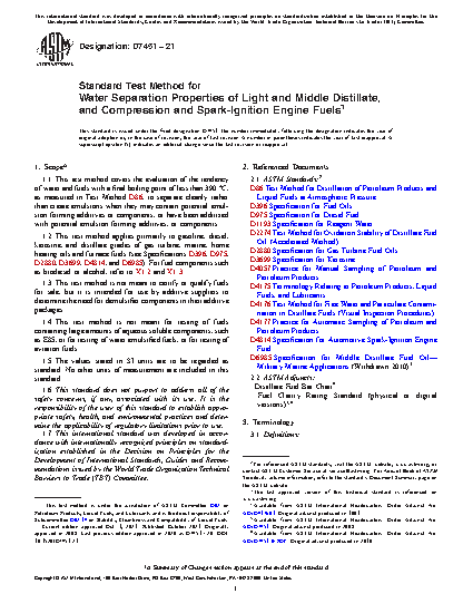 1.1 This test method covers the evaluation of the tendency of water and fuels with a final boiling point of less than 390°C, as measured in Test Method D86, to separate cleanly rather than create emulsions when they may contain potential emulsion forming additives or components, or have been additized with potential emulsion forming additives, or components.