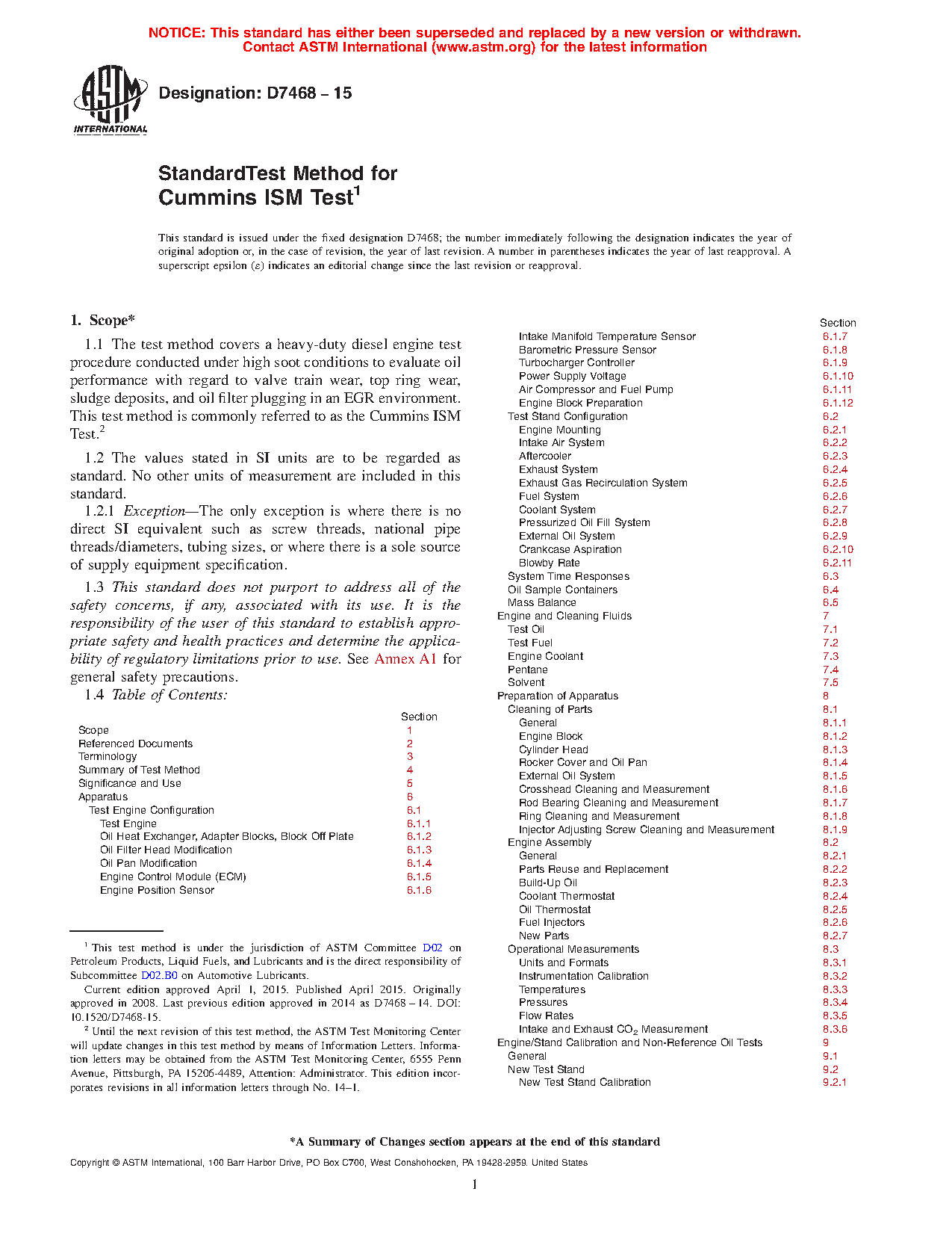 1.1 The test method covers a heavy-duty diesel engine test procedure conducted under high soot conditions to evaluate oil performance with regard to valve train wear, top ring wear, sludge deposits, and oil filter plugging in an EGR environment. This test method is commonly referred to as the Cummins ISM Test.