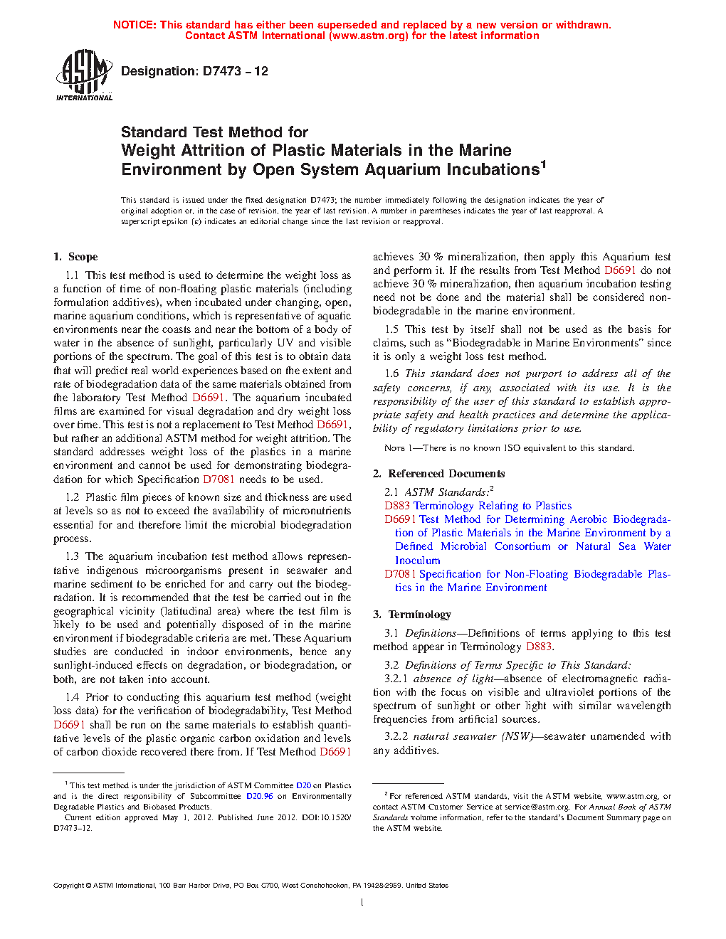 1.3 The aquarium-incubated plastic materials are examined for visual degradation and dry weight loss over time. This test does not provide information on ultimate biodegradation (that is, it is not a replacement for Test Method D6691), but it is an ASTM method for weight attrition. The standard addresses only weight loss as a function of time of the plastics materials in a marine environment and shall not be used for demonstrating ultimate biodegradation.