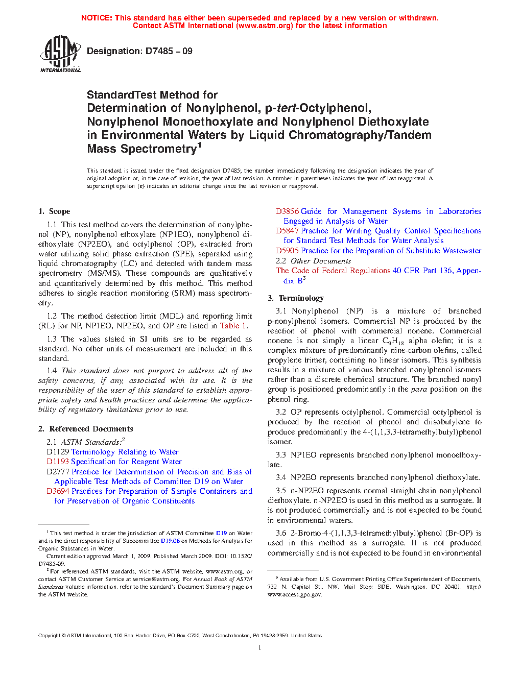 1.1 This test method covers the determination of nonylphenol (NP), nonylphenol ethoxylate (NP1EO), nonylphenol diethoxylate (NP2EO), and octylphenol (OP), extracted from water utilizing solid phase extraction (SPE), separated using liquid chromatography (LC) and detected with tandem mass spectrometry (MS/MS). These compounds are qualitatively and quantitatively determined by this method. This method adheres to single reaction monitoring (SRM) mass spectrometry.