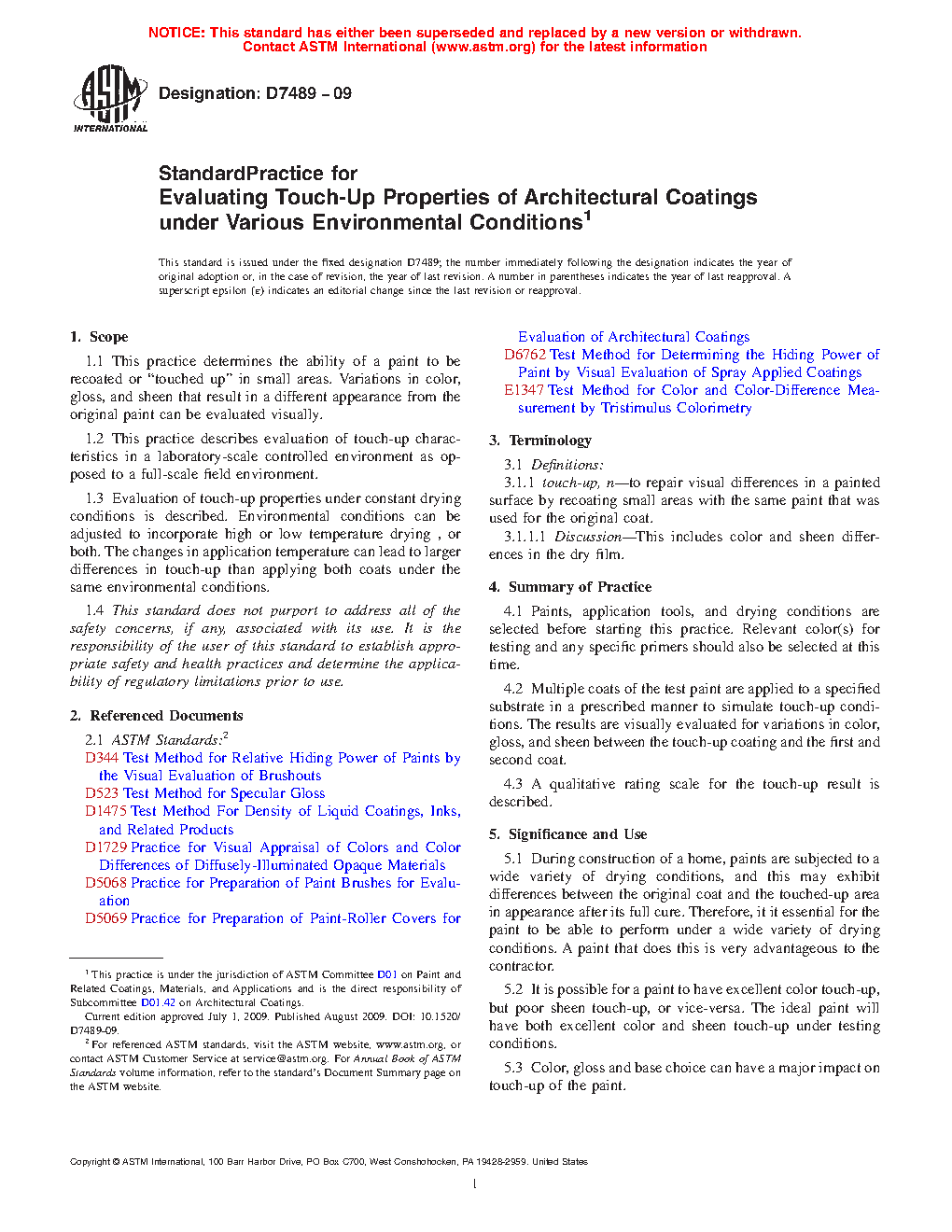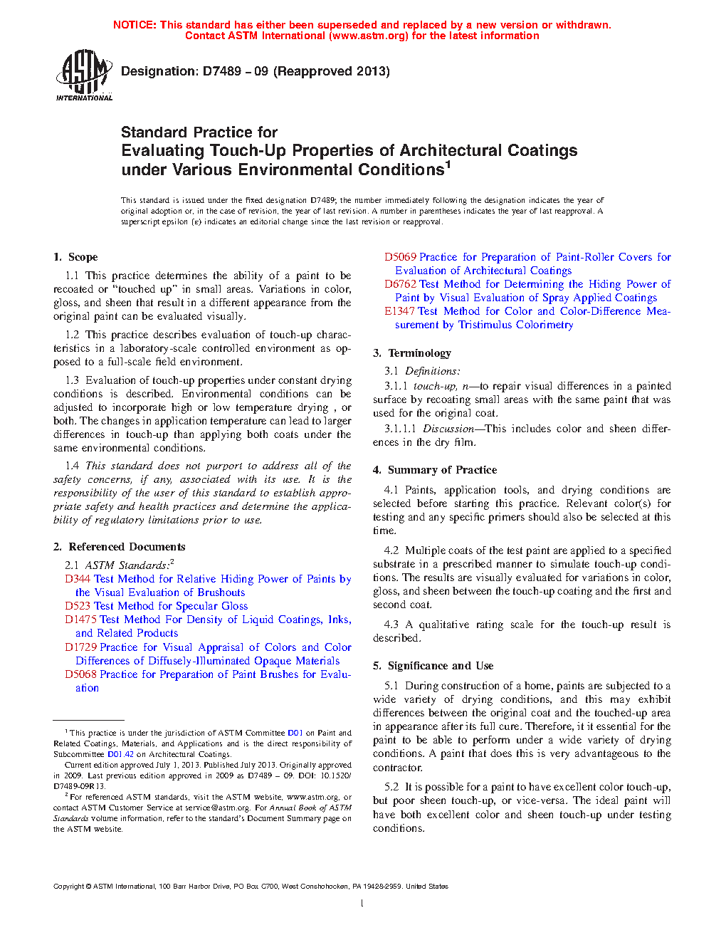 1.1 This practice determines the ability of a paint to be recoated or “touched up” in small areas. Variations in color, gloss, and sheen that result in a different appearance from the original paint may be evaluated visually or with instrumentation to measure gloss or color.